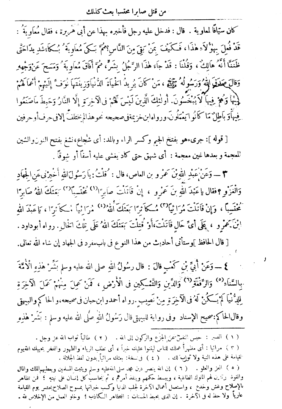 3 - وعن عبد الله بن عمرو بن العاص، قال: قُلْتُ: يا رسول الله أخبرنى عن الجهاد والغزو؟ فقال: يا عبد الله بن عمرو، وإن قاتلت صابراً (¬1) مُحتسباً (¬2) بعثك الله صابراً محتسباً، وإن قاتلت مُرائياً (¬3) مُكاثراً بعثك الله (¬4) مرائيا مكاثرا، ياعبد الله بن عمرو، على أي حال قاتلت، أو قُتلت بعثك الله على تلك الحال. رواه أبو داود.