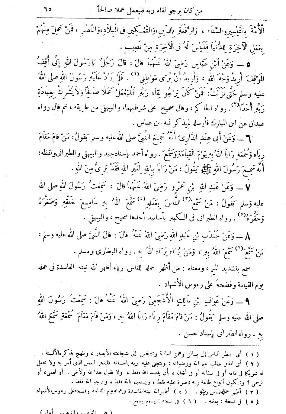 5 - وعن ابن عباس رضي الله عنهما قال: قال رجل يا رسول الله إنى اقف الموقف أريد وجه الله، وأُريد أن يُرى موطني (¬1). فلم يرد عليه رسول الله صلى الله عليه وسم حتى نزلت: فمن كان يرجو لقاء ربه فليعمل عملا صالحا ولا يُشرك بعبادة ربه أحدا (¬2). رواه الحاكم، وقال صحيح على شريطهما، والبيهقى من طريقه، ثم قال رواه عبدان عن ابن المبارك فأرسله لم يذكر فيه ابن عباس.