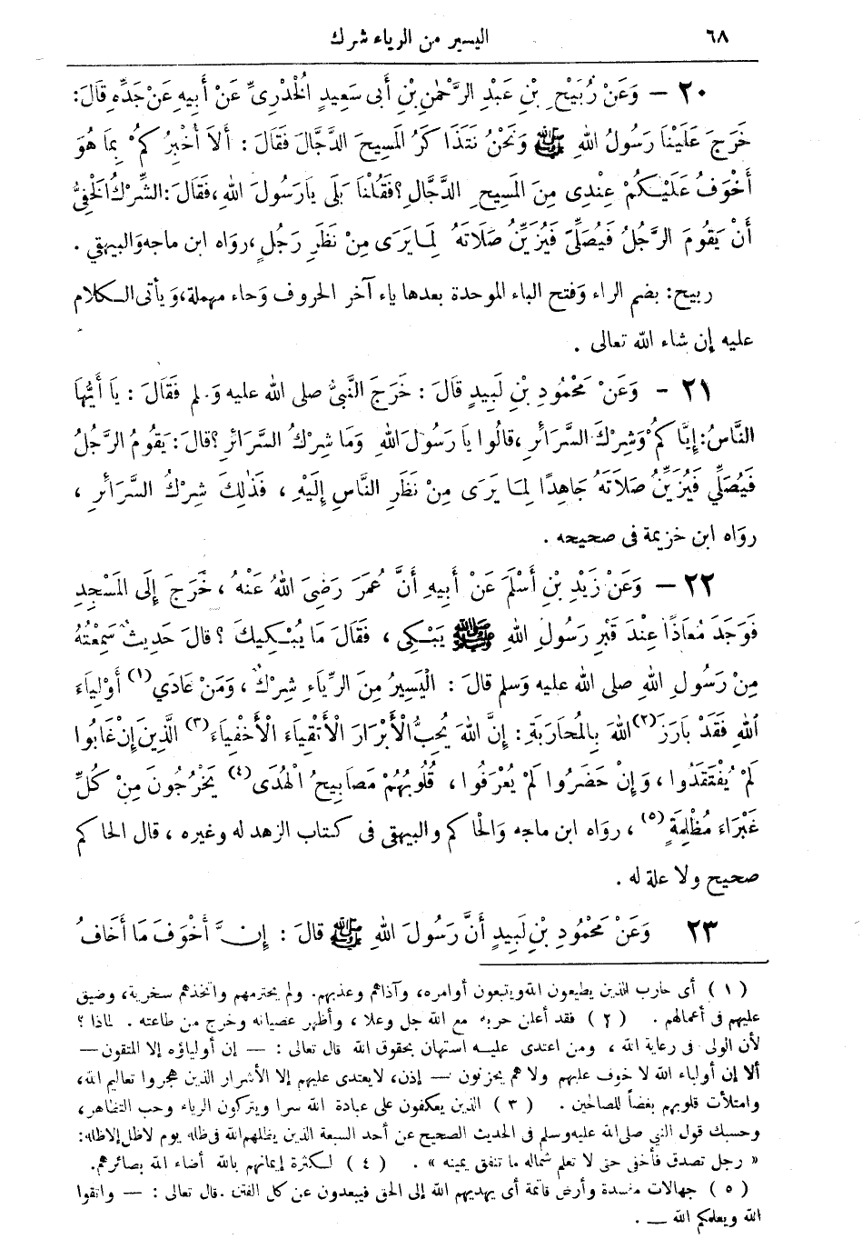 20 - وعن ربيح بن عبد الرحمن بن أبى سعيد الخدرى عن أبيه عن جده قال: خرج علينا رسول الله ? ونحن نتذاكر المسيح الدجال فقال: ألا أُخبركم بما هو أخوف عليكم عندى من المسيح الدجال؟ فقلنا بلى يا رسول الله، فقال: الشرك الخفِيُّ، أن يقوم الرجل فيصلى فَيُزَيِّن صلاته لما يرى من نظر رجل. رواه ابن ماجه والبيهقى.