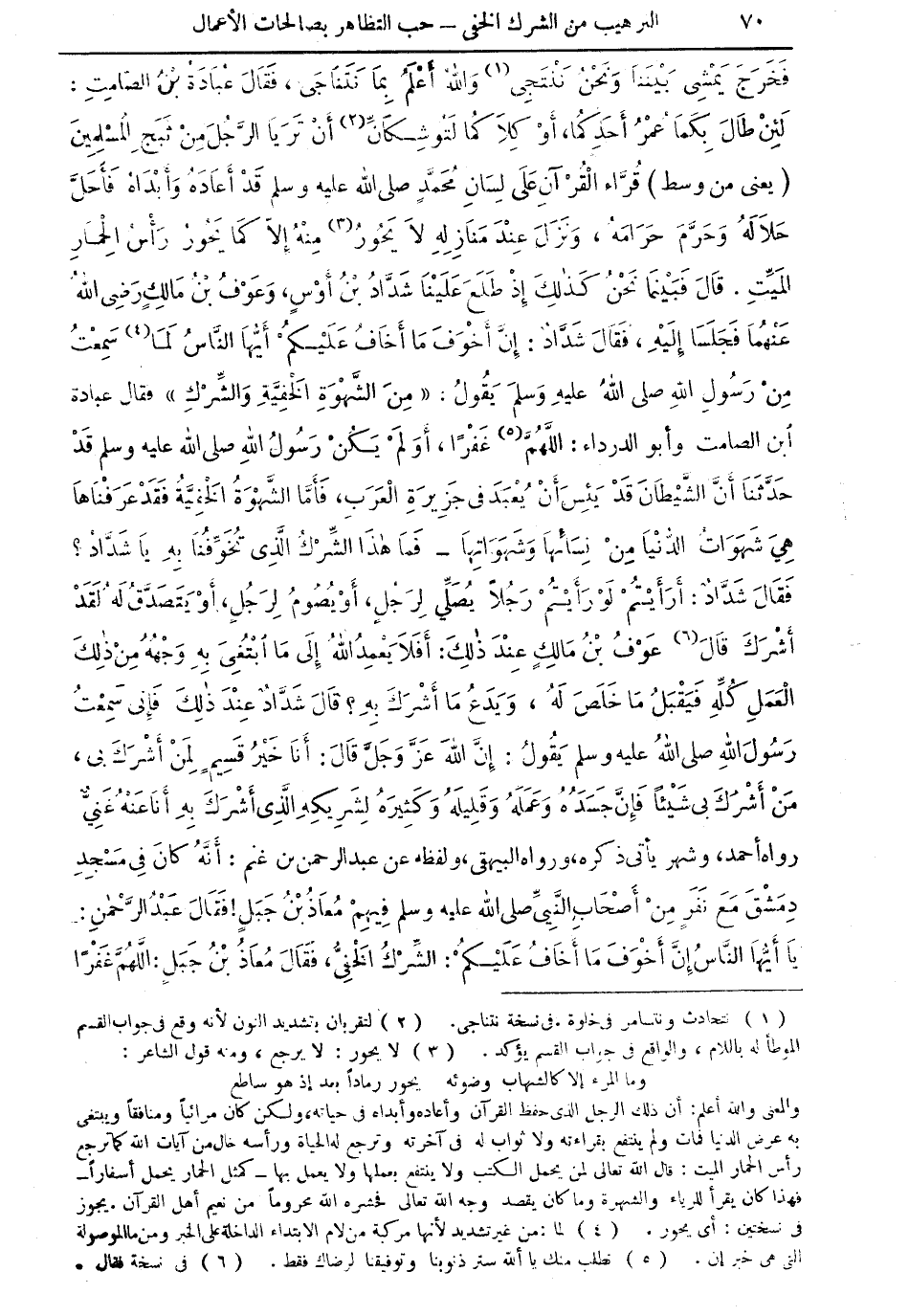 ورواه البيهقى، ولفظه عبد الرحمن بن غنم: أنه كان في مسجد دمشق مع نفر من أصحاب النبى صلى الله عليه وسلم فيهم معاذ بن جبل، فقال عبد الرحمن: يا أيها الناس إن أخوف ما أخاف عليكم: الشرك الخفى، فقال معاذ بن جبل: اللهم غفراً