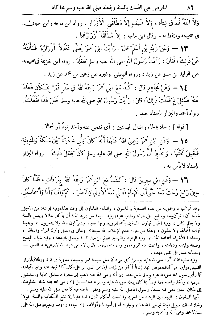 13 - وعن زيد بن أسلم قال: رأيت ابن عمر يصلى محلولا أزراره فسألته عن ذلك، فقال: رأيت رسول الله صلى الله عليه وسلم يفعله. رواه ابن خزيمة في صحيحه عن الوليد بن مسلم عن زيد، ورواه البيهقى وغيره عن زهير بن محمد عن زيد.