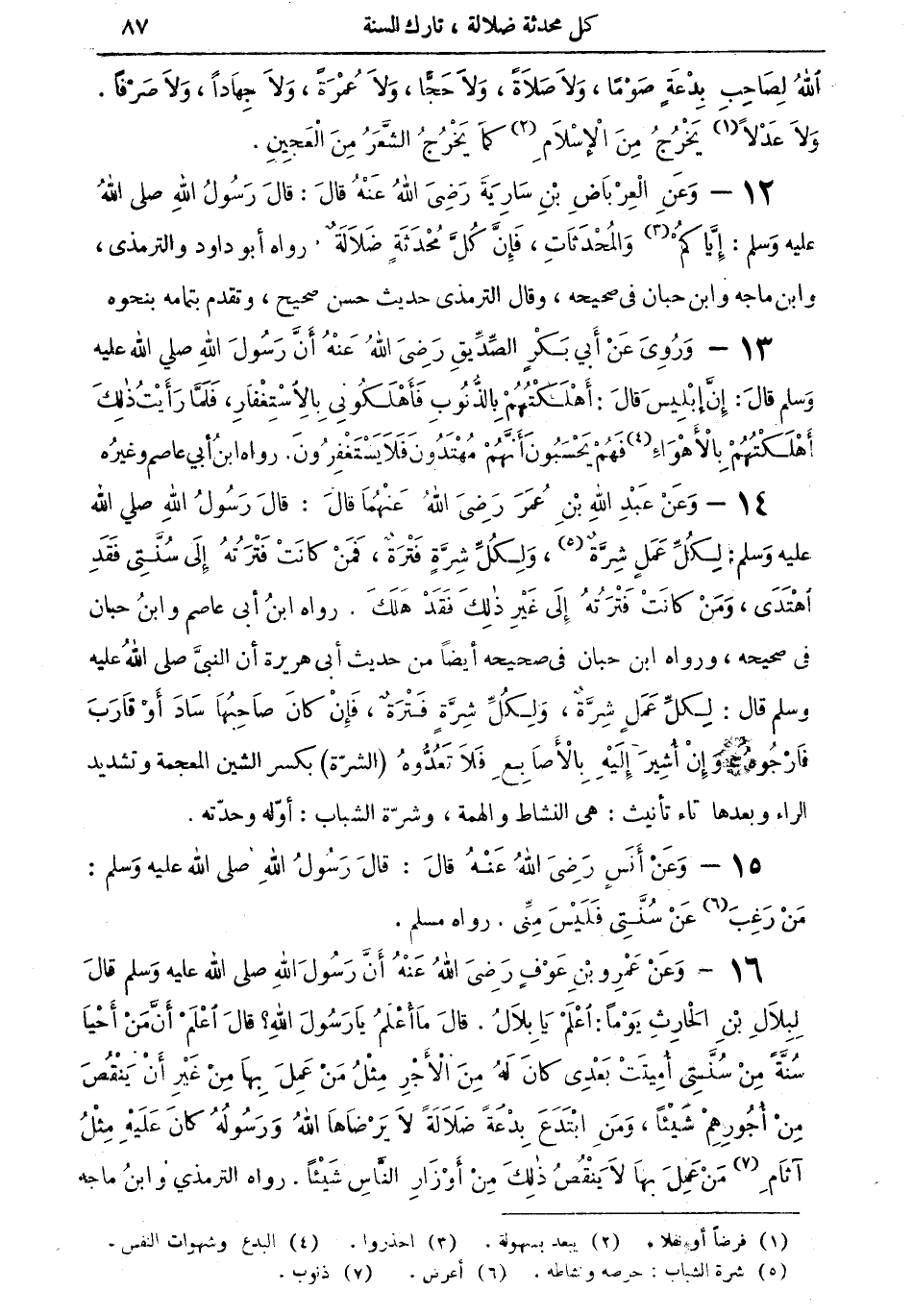 12 - وعن العِرْبَاضِ بن سارية رضي الله عنه قال قال رسول الله صلى الله عليه وسلم: إياكم (¬3) والمحدثات، فان كل محدثة ضلالة. رواه أبو داود والترمذي، وابن ماجه وابن حبان في صحيحه، وقال الترمذي حديث حسن صحيح، وتقدم بتمامه بنحوه.