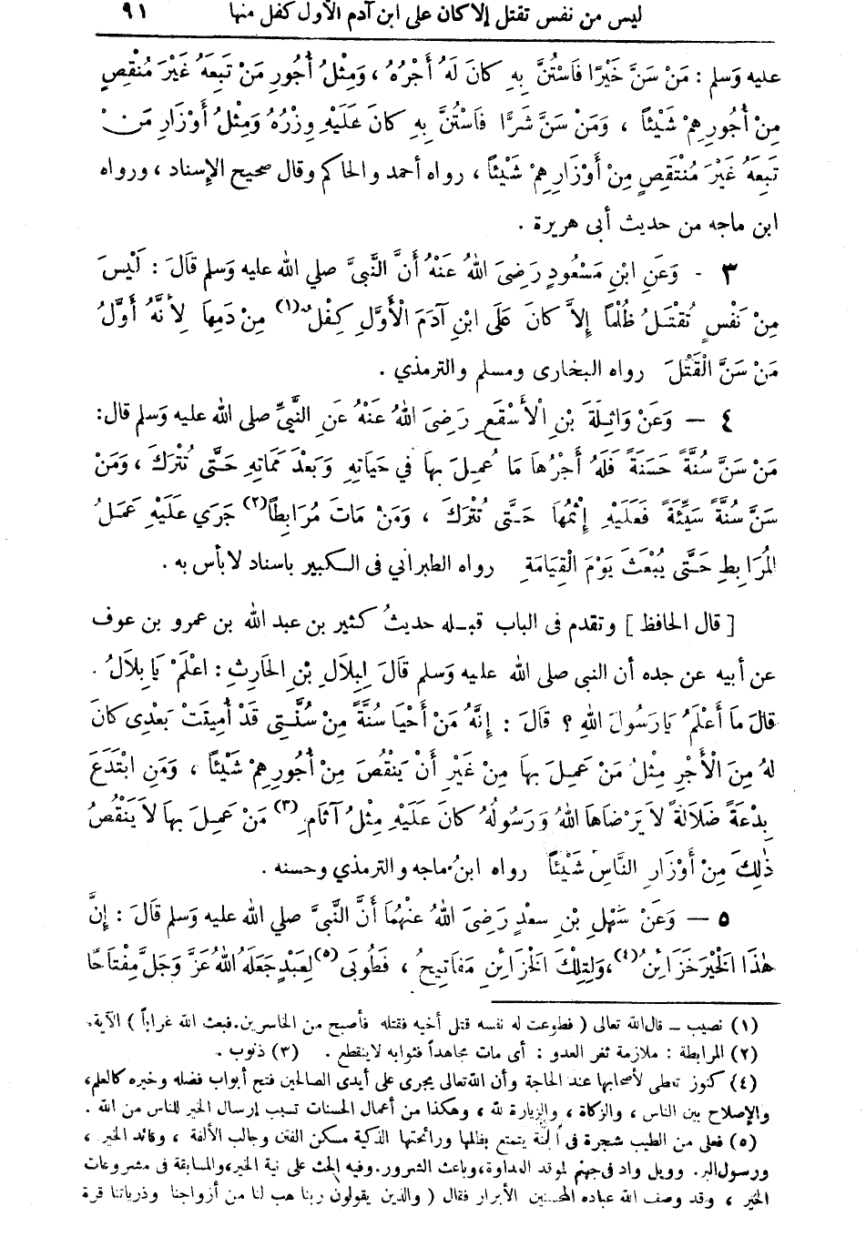 3 - وعن ابن مسعود رضي الله عنه أن النبى صلى الله عليه وسلم قال: ليس من نفسٍ تُقْتَلُ ظُلْماً إلا كان على ابن آدم الأول كفلٌ (¬1) من دمها لأنه أول من سن القتل رواه البخاري وسلم والترمذي.