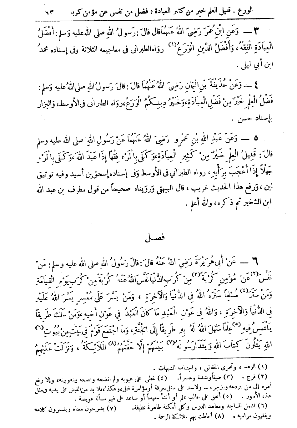 3 - وعن ابن عمر رضي الله عنهما قال: قال رسول الله صلى الله عليه وسلم: أفضلُ العبادة الفقه، وأفضل الدين الورع (¬1) رواه الطبراني في معاجيمه الثلاثة، وفي إسناده محمد ابن أبى ليلى.