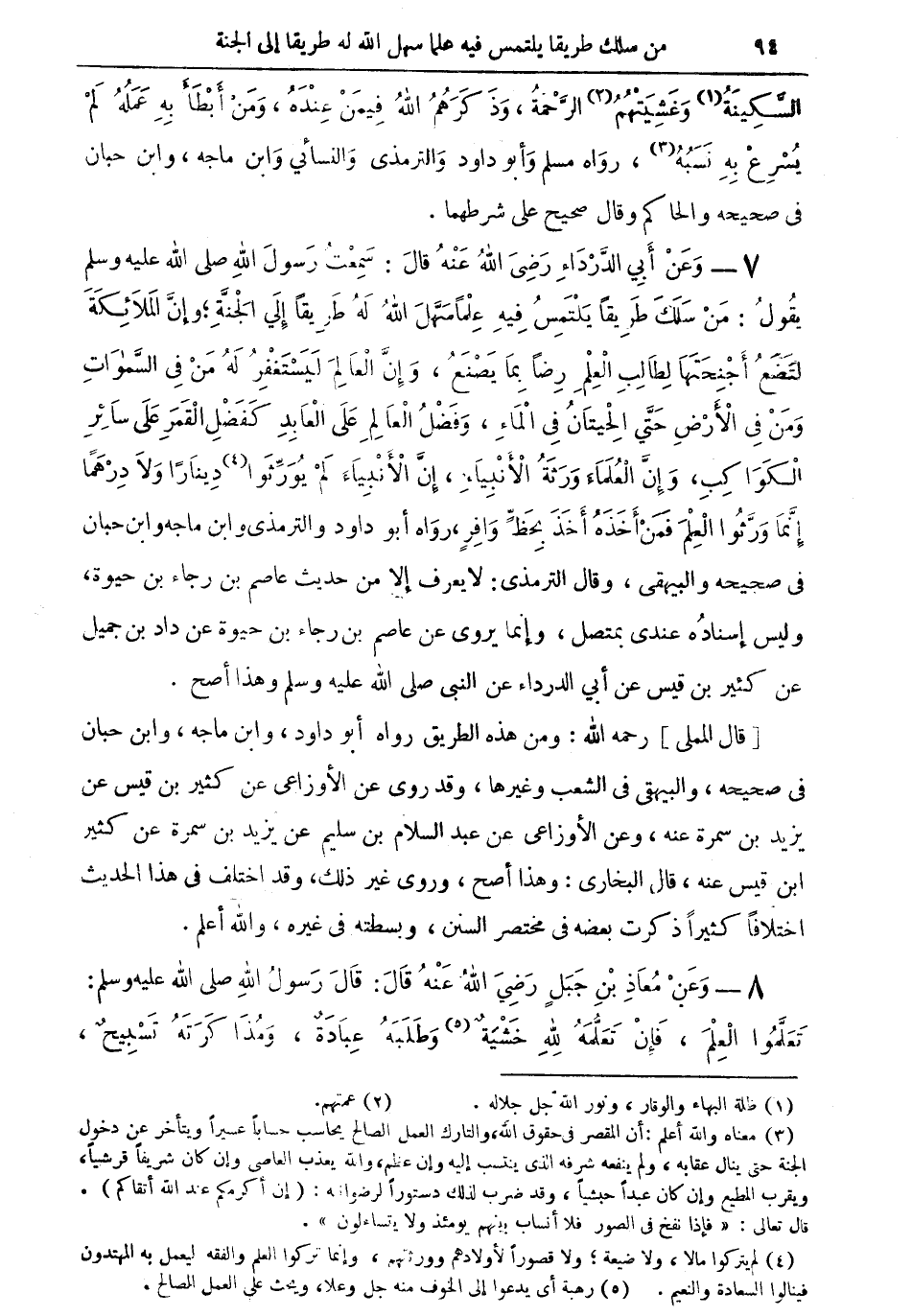 7 - وعن أبي الدرداء رضي الله عنه قال: سمعت رسول الله صلى الله عليه وسلم يقول: من سلك طريقاً يلتمس فيه علماً سهل الله له طريقاً إلى الجنة؛ وإن الملائكة لتضع أجنحتها لطالب العلم رضاً بما يصنع، وإن العالم ليستغفر له من في السموات ومن في الأرض حتى الحيتان في الماء. وفضل العالم على العابد كفضل القمر على سائر الكواكب، وإن العلماء ورثة الأنبياء، إن الأنبياء لم يُوَرِّثُوا (¬4) ديناراً ولا درهماً، إنما ورثوا العلم فمن أخذه أخذ بحظ وافر. رواه أبو داود والترمذي وابن ماجه وابن حبان في صحيحه والبيهقى، وقال الترمذي: لا يعرف إلا من حديث بن رجاء بن حيوة، وليس إسنادُه عندى بمتصل، وإنما يروى عن عاصم بن رجاء بن حيوة عن داود بن جميل عن كثير بن قيس عن أبي الدرداء عن النبى صلى الله عليه وسلم، وهذا أصح.