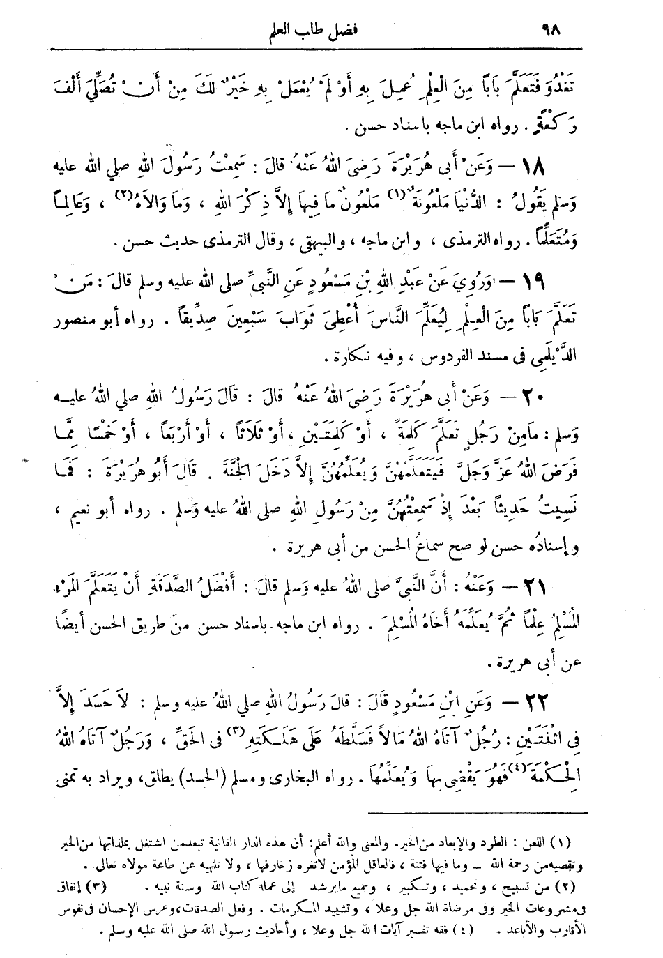 20 - وعن أبي هريرة رضي الله عنه قال: قال رسول الله صلى الله عليه وسلم: ما من رجل تعلم كلمة، أو كلمتين، أو ثلاثاً، أو أربعا، أو خمساً مما فرض الله عز وجل فيتعلمهن ويعلمهن إلا دخل الجنة. قال أبو هريرة: فما نسيت حديثاً بعد إذ سمعتهن من رسول الله صلى الله عليه وسلم. رواه أبو نعيم، وإسنادُه حسن لو صح سماعُ الحسن من أبى هريرة.