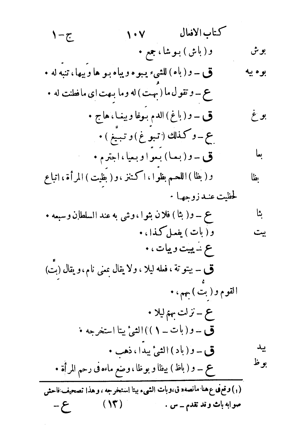 ق- بيتوتة فعله ليلاً ولا يقال بمعنى نام ويقال "بِتَّ" القوم و"بِتُّ" بهم.