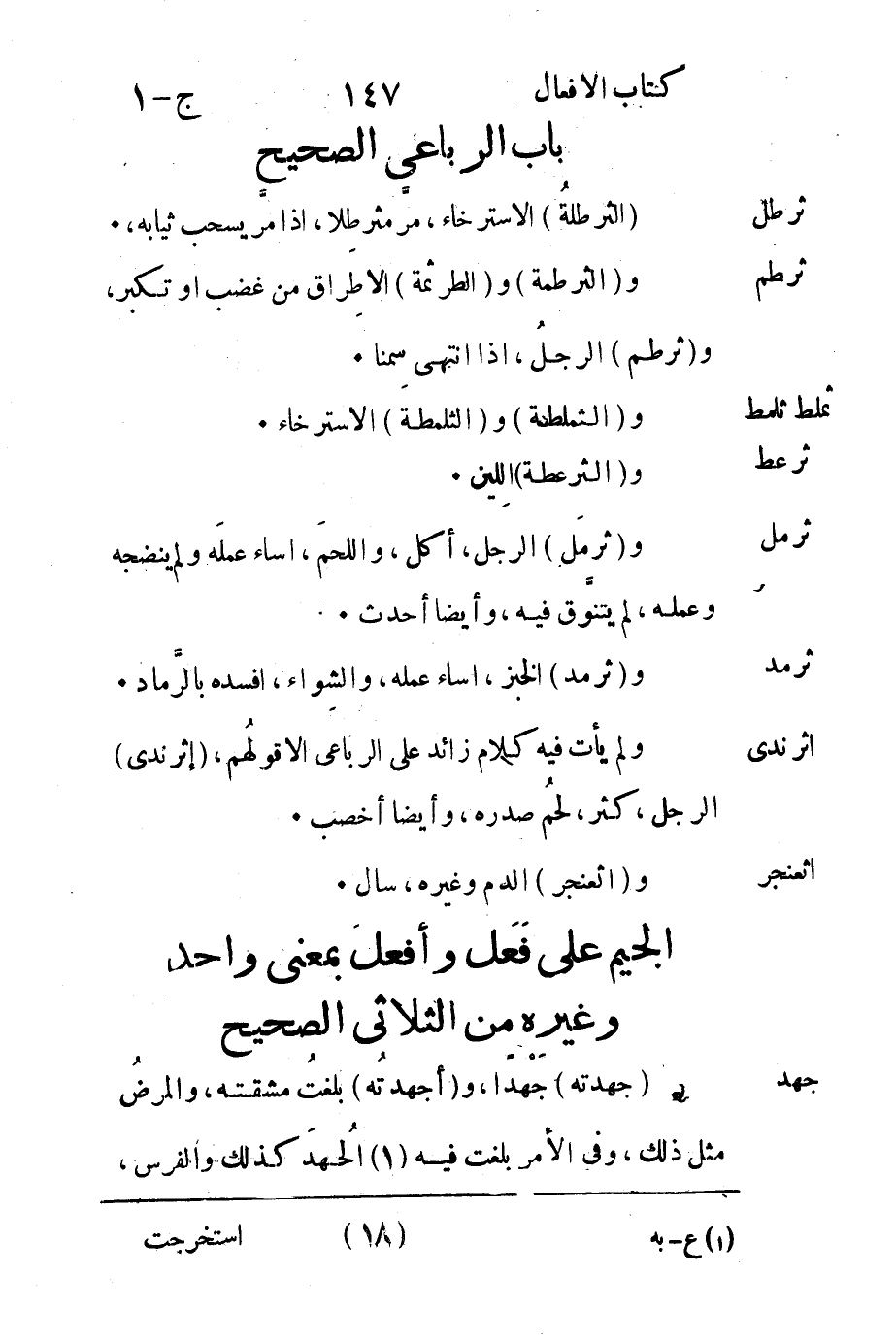 الجيم على فَعَل وأفعلَ بمعنى واحد وغيره من الثلاثي الصحيح