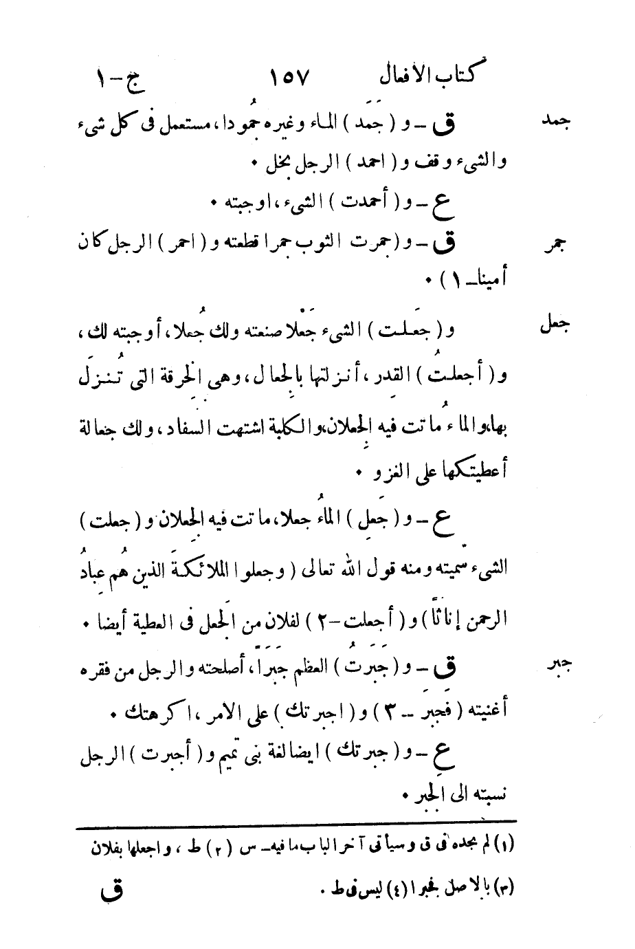 جمد ق-و "جَمَد" الماء وغيره جُموداً مستعمل في كل شيء والشيء وقف و"أحمد" الرجل بخل.
