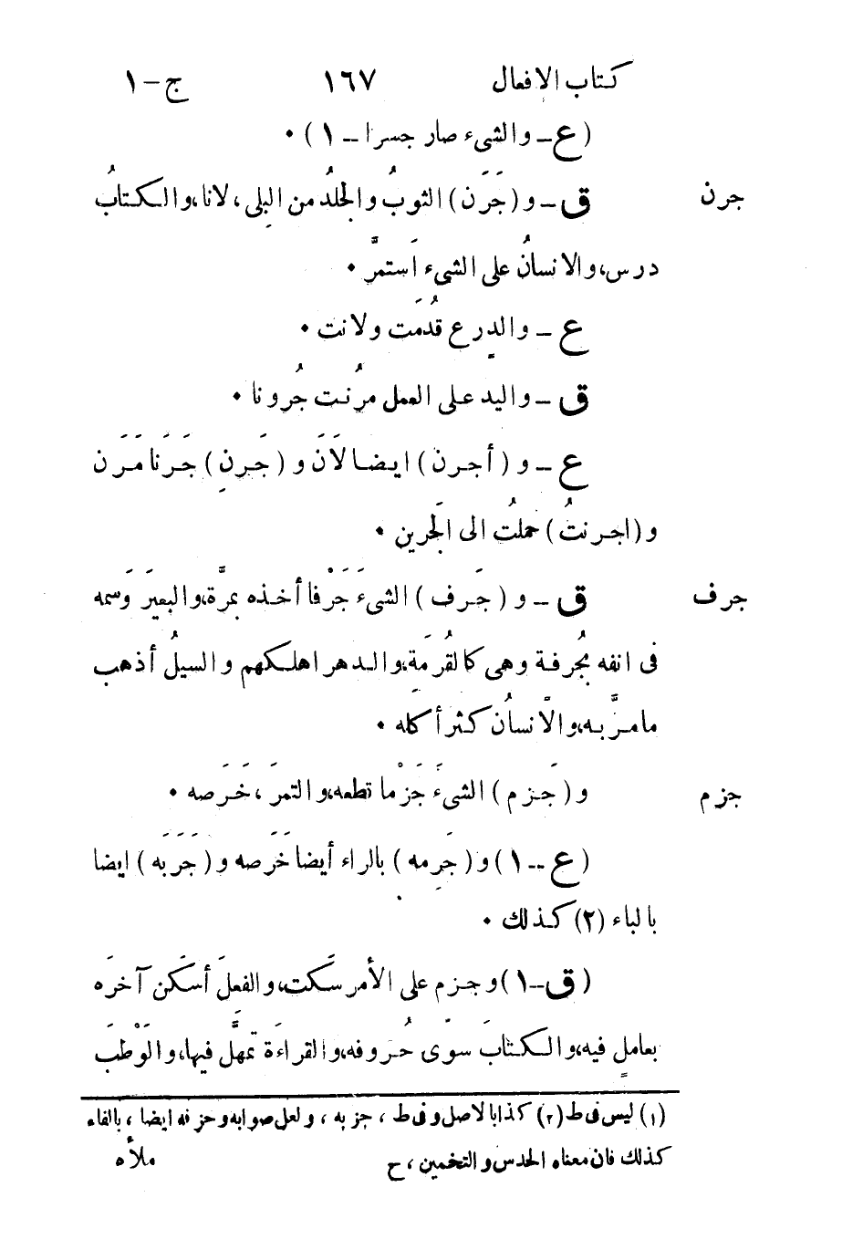 "ق-1" وجزم على الأمر سكَت والفِعلَ أسكَن آخرَه بعاملٍ فيه والكتابَ سوّى حُروفه والقراءَة تمهَّل فيها والوَطْبَ.