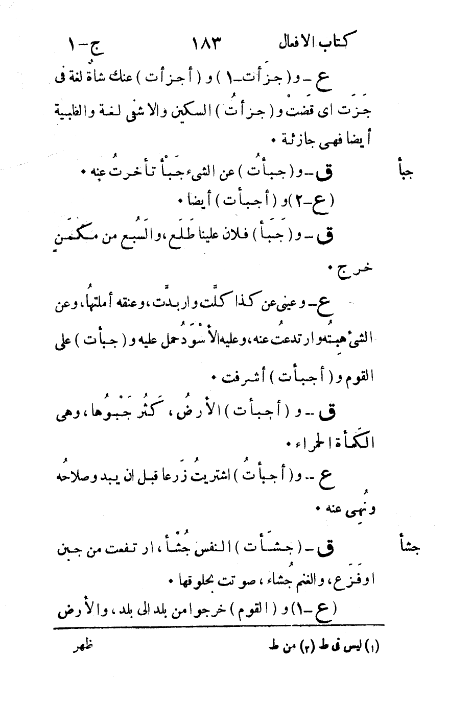 ع - و"جزَأت-1" و"أجزأت" عنك شاةٌ لغة في جَزَت قَضتْ و"جزأتُ" السكين والأشفى لغة والظبية أيضاً فهى جازئة.