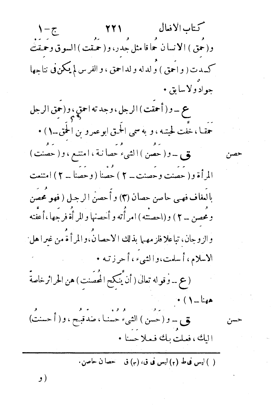 حصن ق- و"حَصُن" الشيءُ حَصانة امتنع و"حَصُنت" المرأة و"حَصَنت وحَصنت-2" حُصْناً "وحَصَناً-2" امتنعت بالعَفاف فهى حاصن حصان3 وأَحصَن الرجل "فهو مُحصن ومُحصِن" و"أحصنْته" امرأتُه وأحصنها والمرأة فرجَها أعفَّته والزوجان تباعلا فلزمهما بذلك الإحصانُ والمرأةُ من غير أهل الإسلام أسلمت والشيءَ أحرزته.