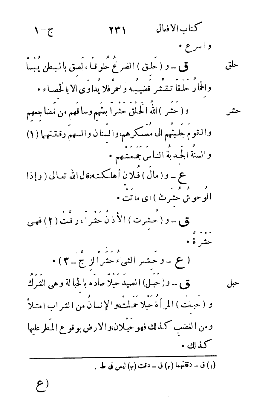 ق- و"حُشِرت" الأذنُ حَشْراً رقَّتْ2 فهي حَشْرةٌ