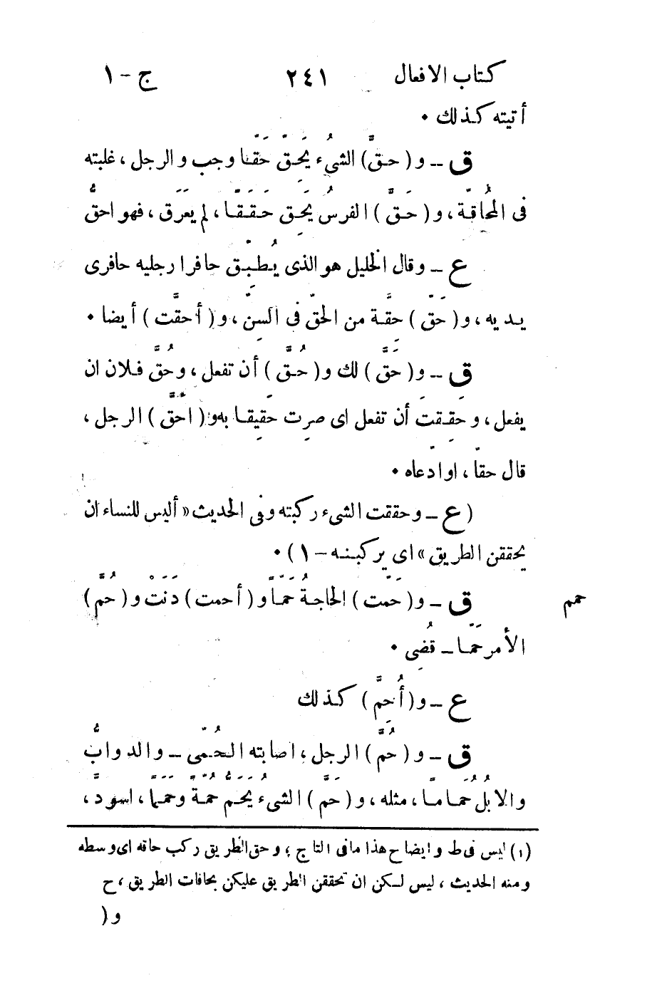 ع- وقال الخليل هو الذي يُطبِّق حافراً رجليه حافري يديه و"حَقَّ" حقَّه من الحقّ في السِنْ و"ألحقَّت" أيضا.