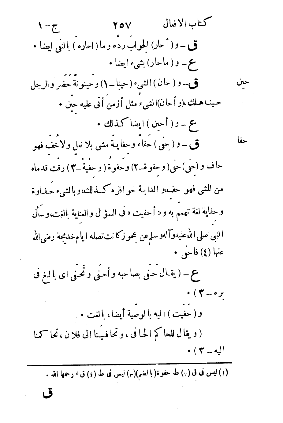 حفا ق- و"حفى" حَفاءً وحِفايةً مشى بلا نعلٍ ولاخُفٍّ فهو حاف و"حِفى" حفى "وحِفوة-2" وحَفوةُ "وحِفْيةً-3" رقّت قدماه من المشى فهو حف والدابة حوافره كذلك وبالشىء حَفاوة وحفاية لغة تهمّم به وأحفيت في السؤال والعِناية بالغت وسأل النبيّ صلى الله عليه وآله وسلم عن عجوز كانت تصله أيام خديجة رضي الله عنها4 فأحفى.