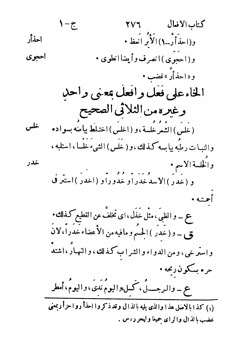 الخاء على فَعَل وأفعَلَ بمعنى واحدٍ وغيره من الثلاثي الصحيح