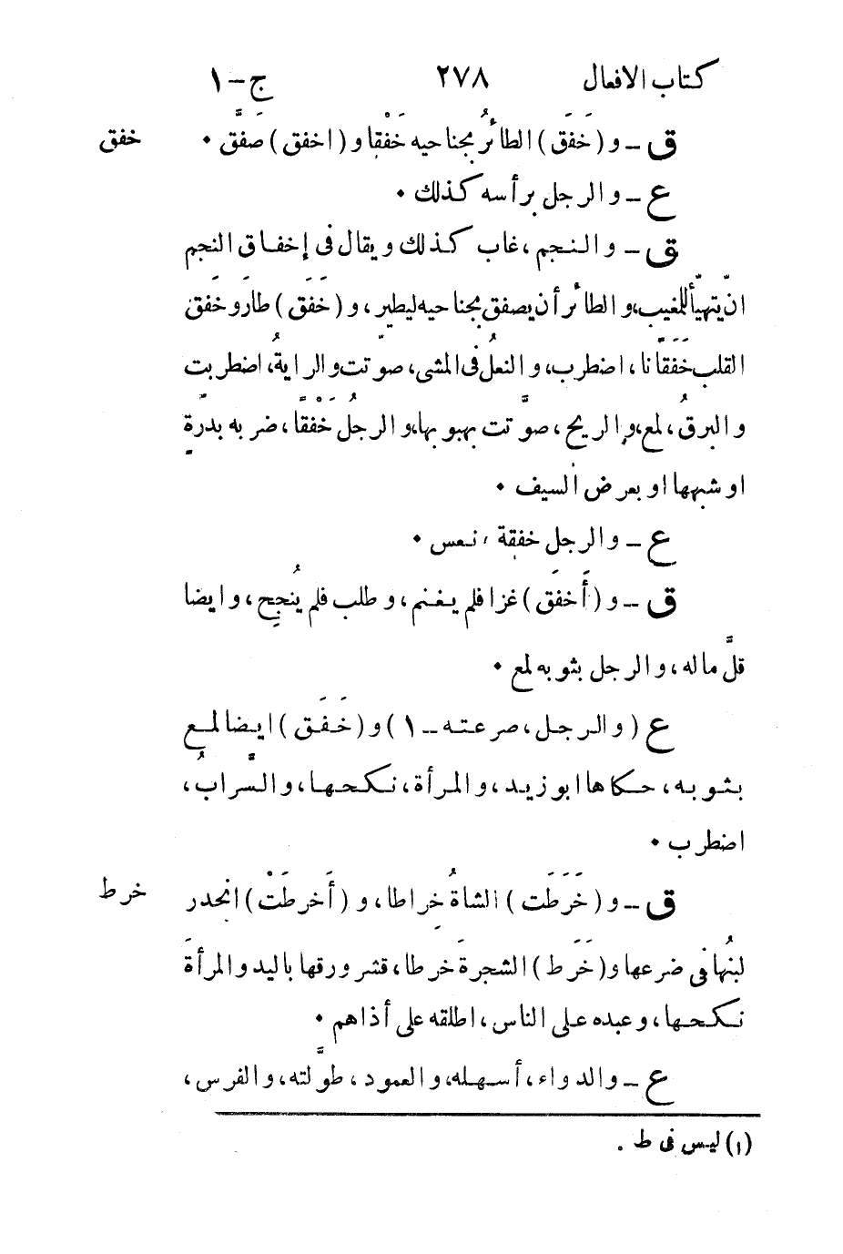 ق- والنجم غاب كذلك ويقال في إخفاق النجم أن يتهيّأ للمغيب والطائر أن يصفق بجناحيه ليطير و"خَفَق" طارَ وخفَق القلب خَفَقَاناً اضطرب والنعلُ في المشي صوتت والرايةُ اضطربت والبرقُ لمع والريح صوَّتت بهبوبها والرجُلُ خَفْقاً ضربه بدّرةٍ أوشبهها أو بعرض السيف.