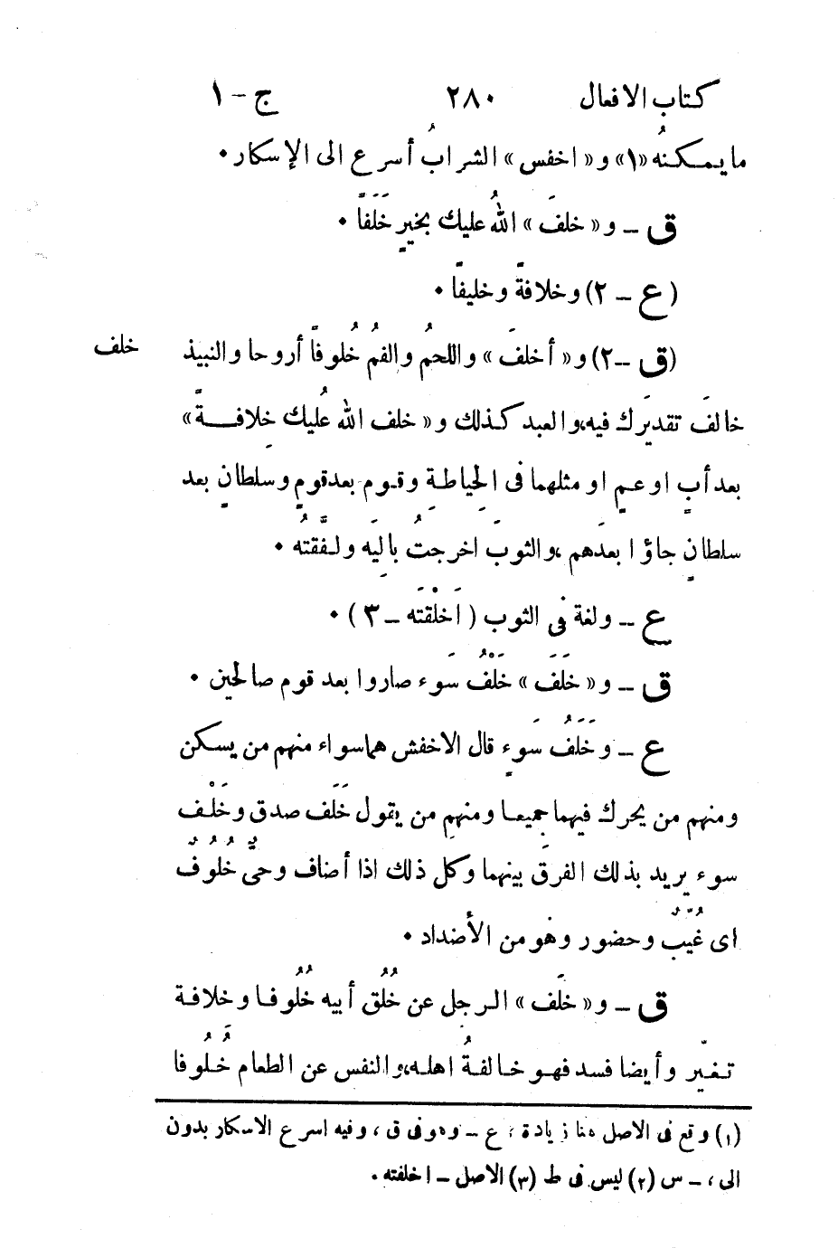 ع- وخَلَفُ سَوء قال الأخفش هما سواء منهم من يسكن ومنهم من يحرك فيهما جميعاً ومنهم من يقول خَلَف صدق وخَلْف سوء يريد بذلك الفرقَ بينهما وكل ذلك إذا أضاف وحىٌّ خُلوُفٌ اى غُيّبٌ وحضور وهو من الأضداد.