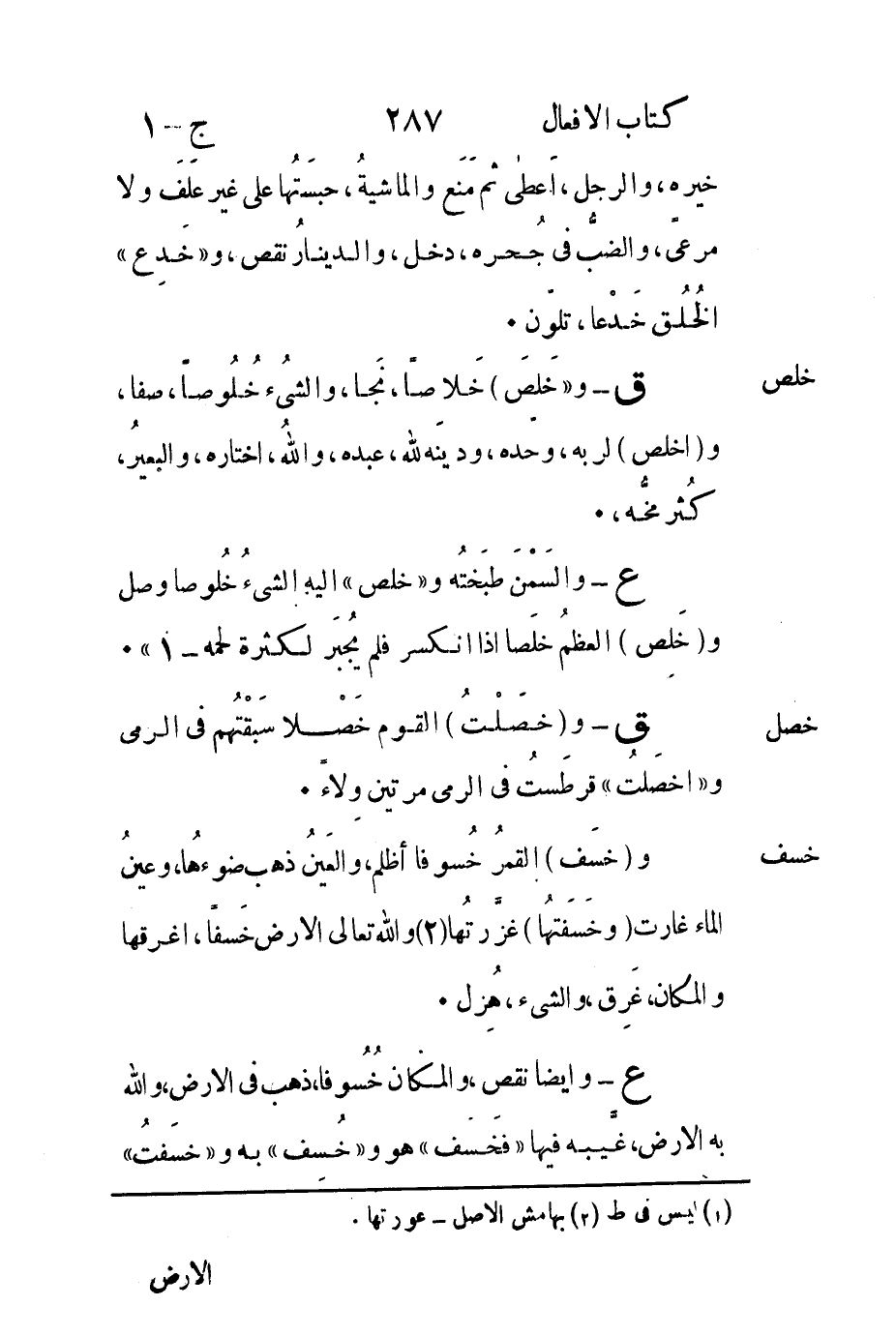 خسف و"خسَف" القمرُ خُسوفاً أظلم والعَينُ ذهب ضوءهُا وعينُ الماء عارت و"خَسَفتُها" غزَّرتُها2 والله تعالى الأرض خَسفاً اغرقها والمكن غَرِق والشىء هُزِل.
