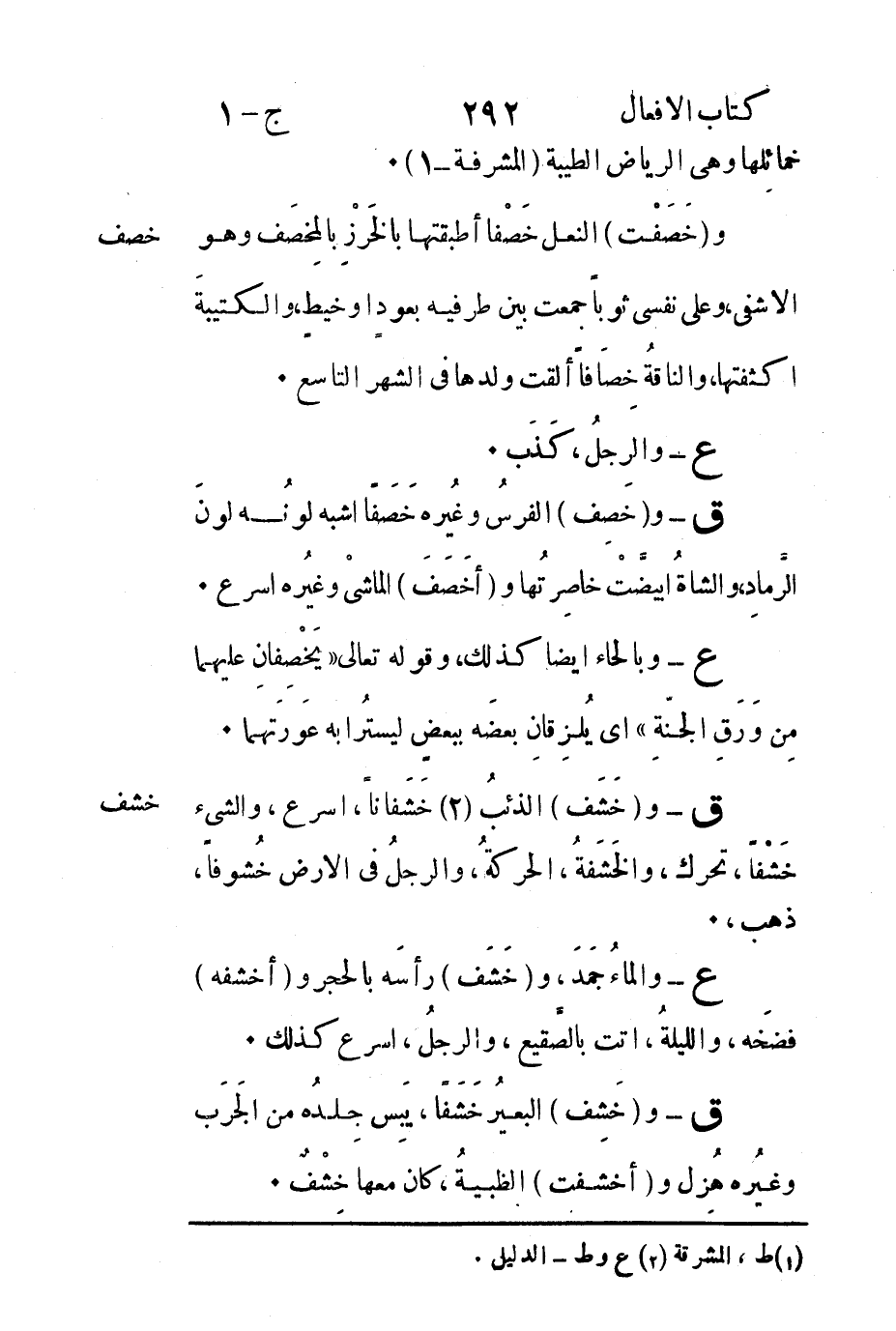 ع- وبالحاء أيضاً كذلك وقوله تعالى: {يَخْصِفانِ عليهما من وَرَق الجنّةِ} اى يُلزِقانِ بعضَه ببعضٍ ليستُرا به عَورتَهما.