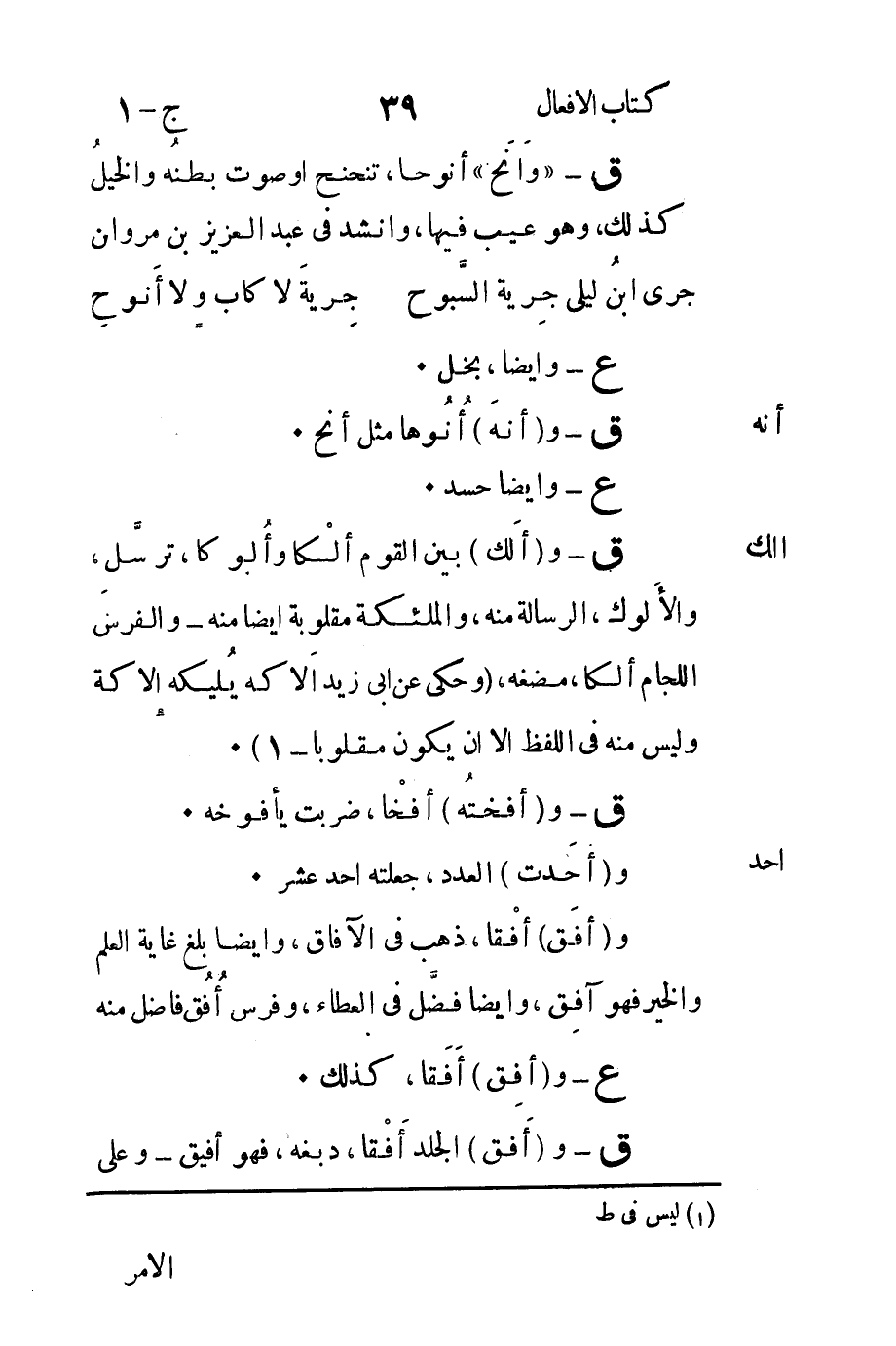 ألك ق - و"أَلك" بين القوم ألْكا وأُلو كا ترسَّل والأَلوك الرسالة منه والملئكة مقلوبة ايضاً منه والفرسَ اللجام ألكا مضغه "وحكى عن ابى زيد أَلاكه يُليكه الاكة وليس منه في اللفظ إلا ان يكون مقلوباً- 1".