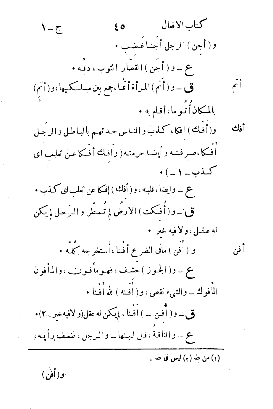 أفك و"أَفَك" إفكا كذب والناس حدثهم بالباطل والرَجل أَفْكا صرفته وأيضاً حرمته "واَفِك أفَكا عن ثعلب اى كذب".