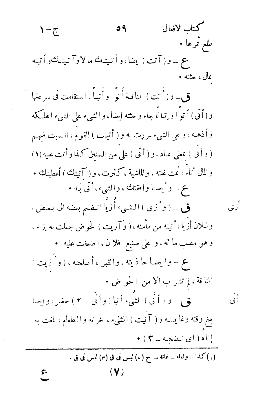 ق-و "أَتت" الناقة أَتواً وأَتياً استقامت في سرعتها و"أتى" أتواً وإتياناً جاء وجئته أيضاً والشىء على الشيء اهلكه وأذهبه وعلى الشيء مررت به و"أتيت" القومَ انتسبت فيهم "وأتَى" بمعنى عاد و"أتى" على من السنين كذا وأتت عليه1 والمال أتاءَ نمت غلته والماشية كثرت و"آتيتك" أعطيتك.