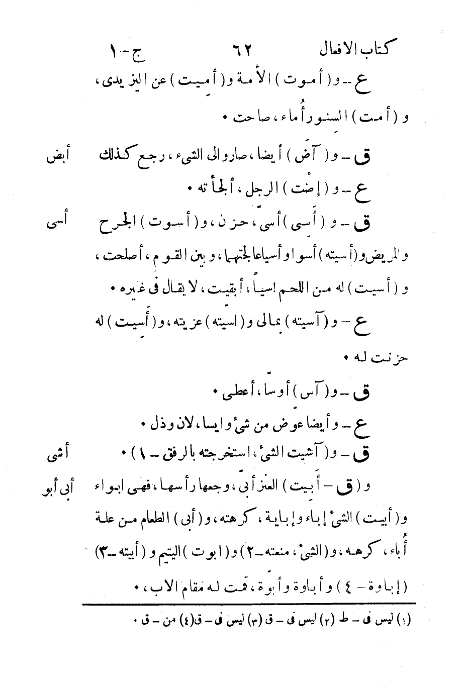 و"أبيت" الشيء إباء وإباية كرهته و"أبى" الطعام من علة أُباء كرهه والشيء منعته-2 و"أبوت" اليتيم و"أبيته-3" "إباوة-4" وأباوة وأبوّة قمت له مقام الأب.