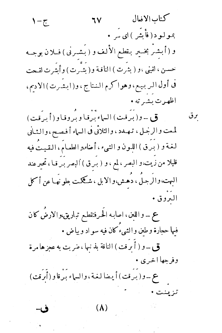 برق ق-و "بَرَقت" السماء بَرْقا وبُروقا و"أبرَقت" لمعت والرجل تهدد والثلاثي في السماء أفصح والثاني لغة و"بَرَق" اللون والشىء أضاء والطعامَ القيتُ فيه قليلاً من زَيت والبصر لمع و"بَرِق" البصر بَرَقا تحير عند البهت والرَجلُ دهِش والابل شكت بطونَها عن أكل البَرْوق.