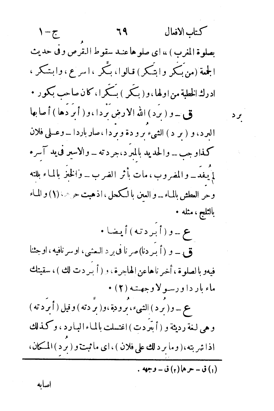 ق-و "أبرَدنا" صرنا في برد العشي أو سرنا فيه أو جئنا فيه وبالصلوة أخرناها عن الهاجرة و"أبرَدت لك" سقيتك ماءً بارداً ورسولا وجهته2.