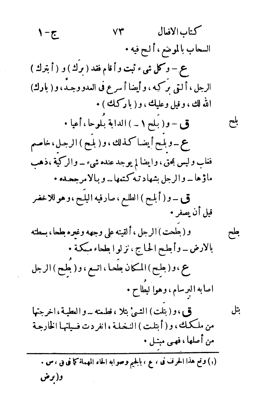 ع - وبلّح أيضاً كذلك و"بلَح" الرجل خاصم فغلب وليس بمحقّ وأيضاً لم يوجد عنده شيء والركيّة ذهب ماؤها والرجل بشهادته كتمها وبالأمر جحده.
