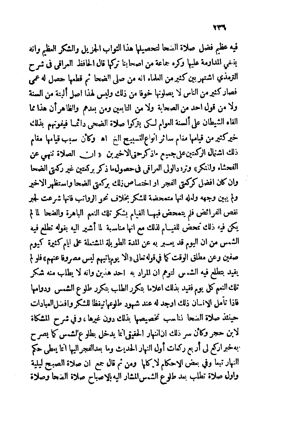فيه عظيم فضل صلاة الضحى لتحصيلها هذا الثواب الجزيل والشكر العظيم وأنه ينبغي المداومة عليها وكره جماعة من أصحابنا تركها قال الحافظ العراقي في شرح الترمذي اشتهر بين كثير من العلماء أنه من صلى الضحى ثم قطعها حصل له عمى فصار كثير من الناس لا يصلونها خوفاً من ذلك وليس لهذا أصل ألبتة من السنة ولا من قول أحد من الصحابة ولا من التابعين ومن بعدهم والظاهر أن هذا مما ألقاه الشيطان على ألسنة العوام لكي يتركوا صلاة الضحى دائماً فيفوتهم بذلك خير كثير من قيامها مقام سائر أنواع التسبيح الخ. اهـ. وكأن سبب قيامها مقام ذلك اشتمال الركعتين على جميع ما ذكر حق الأخيرين {إِنَّ الصَّلَاةَ تَنْهَى عَنِ الْفَحْشَاءِ وَالْمُنْكَرِ} [العنكبوت: 45] وتردد الولي العراقي في حصول ما ذكر بركعتين غير ركعتي الضحى وإن كان أفضل كركعتي الفجر أو اختصاص ذلك بركعتي الضحى واستظهر الأخير ولم يبين وجهه ولعله أنها متمحضة للشكر بخلاف نحو الرواتب فإنها شرعت لجبر نقص الفرائض لم يتمحض فيها القيام بشكر تلك النعم الباهرة والضحى لما لم يكن فيه ذلك تمحض للقيام لذلك مع أنها مناسبة لما أشير إليه بقوله تطلع فيه الشمس من إن اليوم قد يعبر به عن المدة الطويلة المشتملة على أيام كثيرة كيوم صفين وعن مطلق الوقت كما في قوله تعالى {أَلَا يَوْمَ يَأْتِيهِمْ لَيْسَ مَصْرُوفًا عَنْهُمْ} [هود: 8] فلو لم يقيد بتطلع فيه الشمس لتوهم إن المراد به أحد هذين وأنه لا يطلب منه شكر تلك النعم كل يوم فقيد بذلك إعلاماً بتكرر الطلب بتكرر طلوع الشمس ودوامها فإذا تأمل الإنسان ذلك أوجد له عند شهود طلوعها تيقظاً للشكر وأفضل العبادات حينئذٍ صلاة الضحى فناسب تخصيصها بذلك دون غيرها، وفي شرح المشكاة لابن حجر وكأن سر ذلك إن النهار الحقيقي إنما يدخل بطلوع الشمس كما يصرح به خبر اركع لي أربع ركعات أول النهار الحديث وما بعد الفجر إليها إنما يعطي حكم النهار تبعًا وفي بعض الأحكام لا كلها ومن ثم قال جمع إن صلاة الصبح ليلية وأول صلاة تطلب بعد طلوع الشمس المشار إليه بالإصباح صلاة الضحى وصلاة