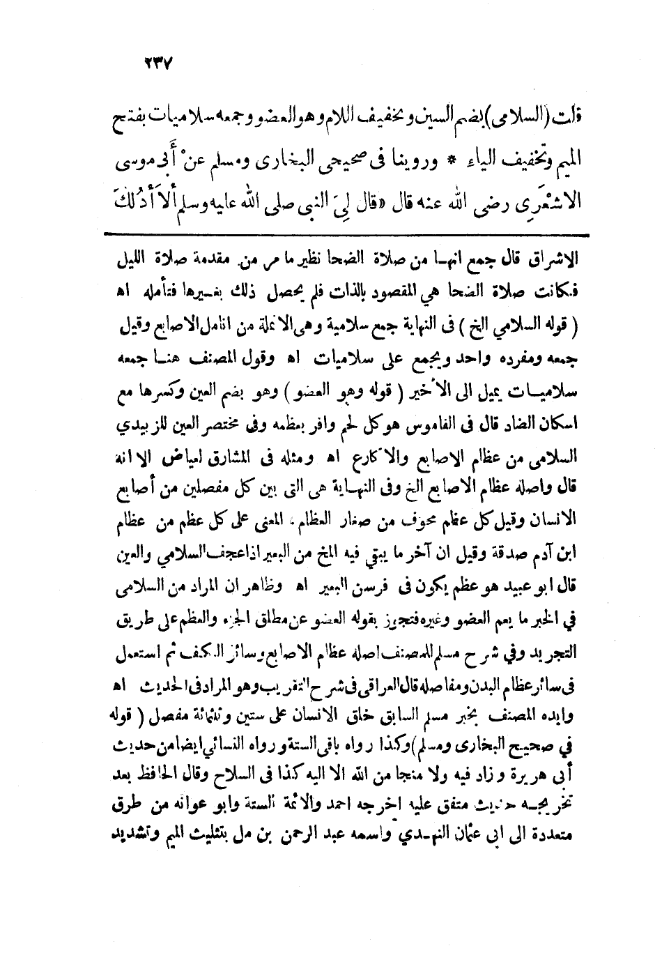 الإشراق قال جمع أنها من صلاة الضحى نظير ما مر من مقدمة صلاة الليل فكانت صلاة الضحى هي المقصود بالذات فلم يحصل ذلك بغيرها فتأمله اهـ .. قوله: (السلامى إلخ) في النهاية جمع سلامية وهي الأنملة من أنامل الأصابع وقيل جمعه ومفرده واحد ويجمع على سلاميات اهـ. وقول المصنف هنا جمعه سلاميات يميل إلى الأخير. قوله: (وهو