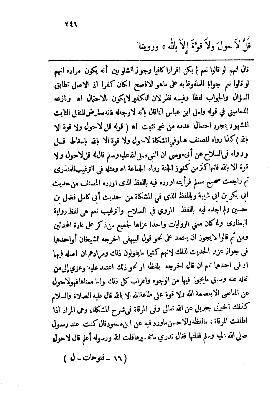 قال أنهم لو قالوا نعم لم يكن إقراراً كافياً وجوز الشلوبين أنه يكون مراده أنهم لو قالوا نعم جواباً للملفوظ به على ما هو الأفصح لكان كفراً إذ الأصل تطابق السؤال والجواب لفظاً وفيه نظر لأن التكفير لا يكون بالاحتمال اهـ، ونازعه الدماميني في قوله ولعل ابن عباس إنما قال بأنه لا وجه له فإنه معارض للنقل الثابت المشهور بمجرد احتمال عدمه من غير تثبت اهـ. قوله: (قُلْ لاَ حَولَ وَلَا قوَّةَ إلا بالله) كذا رواه المصنف هنا وفي المشكاة لا حول ولا قوة إلاَّ بالله بإسقاط قل ورواه في السلاح عن أبي موسى إن النبي - صلى الله عليه وسلم - قال له قل لا حول ولا قوة إلاّ بالله فإنها كنز من كنوز الجنة رواه الجماعة اهـ، ومثله في الترغيب للمنذري ثم راجعت صحيح مسلم فرأيته أورده فيه باللفظ الذي أورده المصنف من حديث أبي بكر بن أبي شيبة وباللفظ الذي في المشكاة من حديث أبي كامل فضل بن حسين ولم أجده فيه باللفظ المروي في السلاح والترغيب نعم هي لفظ رواية البخاري ولما كان معنى الروايات واحداً عزاها لجميع من ذكر على عادة المحدثين ومن ثم قالوا لا يجوز أن يعتمد على نحو قول البيهقي أخرجه الشيخان أو أحدهما في جواز عزو الحديث لذلك لأنهم كثيراً ما يقولون ذلك ومرادهم إن أصله فيهما أو في أحدهما نعم إن قال أخرجه بلفظه أو نحو ذلك اعتمد عليه وعزى إلى من نقله عنه وسبق ما يجوز فيها من الوجوه وإعراب كل ذلك وأما معناها فهو لا حول عن المعاصي إلاَّ بعصمة الله ولا قوة على طاعة الله إلَّا بالله قال عليه الصلاة والسلام كذلك أخبرني جبريل عن الله تعالى وفي المرقاة في شرح المشكاة، وهي المراد إذا أطلقت المرقاة، ما لفظه والأحسن ما ورد فيه عن ابن مسعود قال كنت عند رسول الله - صلى الله عليه وسلم - فقلتها فقال تدري ما تفسيرها قلت الله ورسوله أعلم قال لا حول