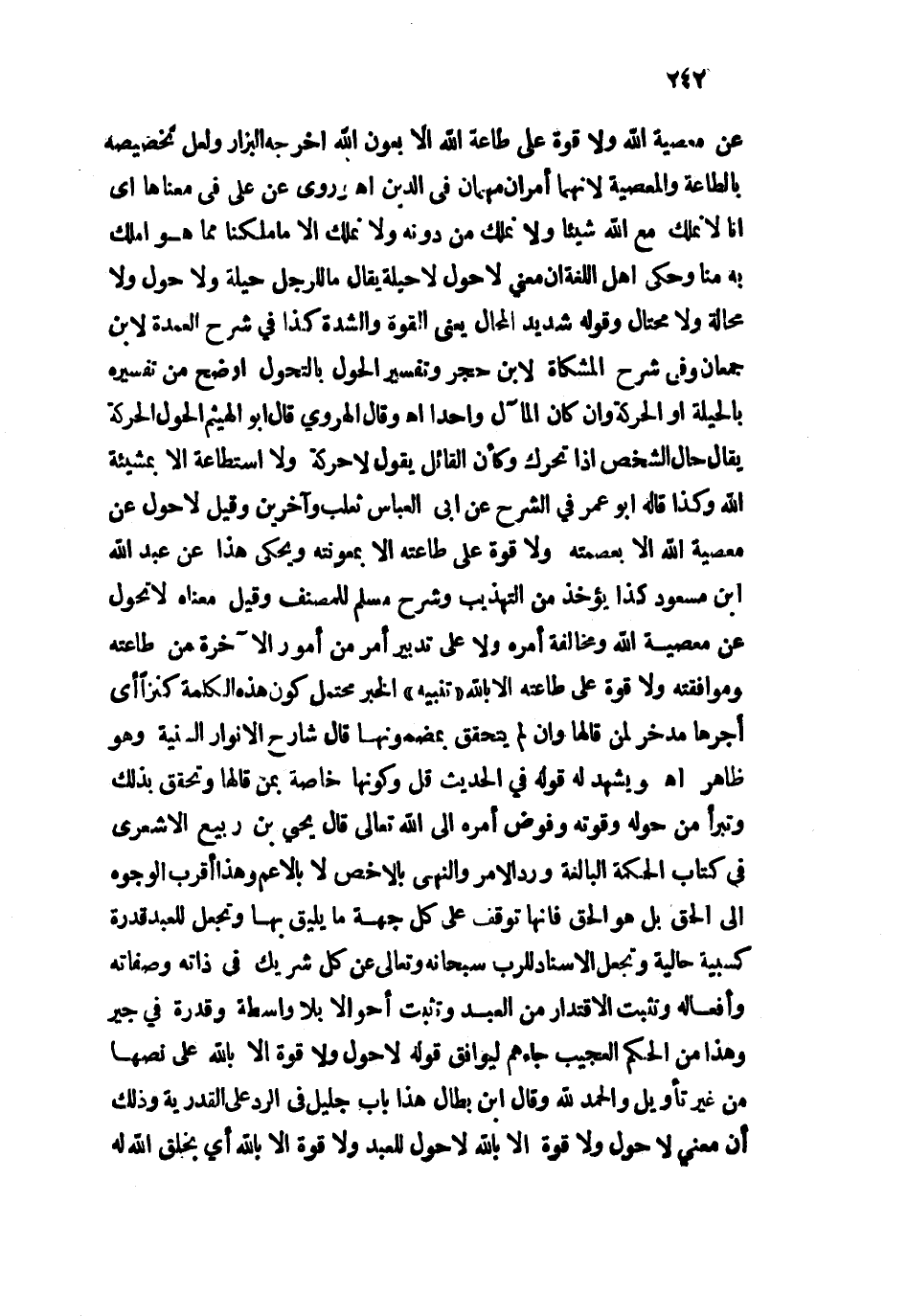 على طاعته إلاَّ بالله "تنبيه" الخبر محتمل كون هذه الكلمة كنزاً أي أجرها مدخر لمن قالها وإن لم يتحقق بمضمونها قال شارح الأنوار السنية وهو ظاهر اهـ، ويشهد له قوله في الحديث قل وكونها خاصة بمن قالها وتحقق بذلك وتبرأ من حوله وقوته وفوض أمره إلى الله تعالى قال يحيى بن ربيع الأشعري في كتاب الحكمة البالغة ورد الأمر والنهي بالأخص لا بالأعم وهذا أقرب الوجوه إلى الحق بل هو الحق فإنها توقف على كل جهة ما يليق بها وتجعل للعبد قدرة كسبية حالية وتجعل الإسناد للرب سبحانه وتعالى عن كل شريك في ذاته وصفاته وأفعاله وتثبت الاقتدار من العبد وتثبت أحوالاً بلا واسطة وقدرة في جير وهذا من الحكم العجيب جاءهم ليوافق قوله لا حول ولا قوة إلاَّ بالله على نصها من غير تأويل والحمد لله وقال ابن بطال هذا باب جليل في الرد على القدرية وذلك أن معنى لا حول ولا قوة إلاَّ بالله لا حول للعبد ولا قوة إلاَّ بالله أي بخلق الله له