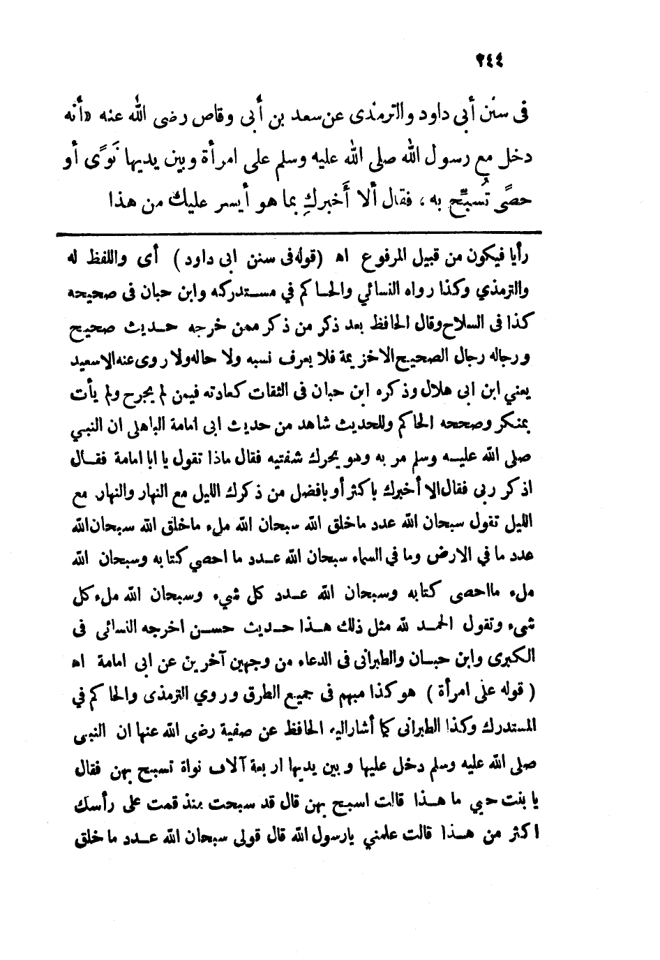 وابن حبان في صحيحه كذا في السلاح وقال الحافظ بعد ذكر من ذكر ممن خرجه حديث صحيح ورجاله رجال الصحيح إلا خزيمة فلا يعرف نسبه ولا حاله ولا روى عنه إلاَّ سعيد يعني ابن أبي هلال وذكره ابن حبان في الثقات كعادته فيمن لم يجرح ولم يأت بمنكر وصححه الحاكم وللحديث شاهد من حديث أبي أمامة الباهلي إن النبي - صلى الله عليه وسلم - مر به وهو يحرك شفتيه فقال ماذا تقول يا أبا أمامة فقال أذكر ربي فقال إلا أخبرك بأكثر أو بأفضل من ذكرك الليل مع النهار والنهار مع الليل تقول سبحان الله عدد ما خلق الله سبحان الله ملء ما خلق الله سبحان الله عدد ما في الأرض وما في السماء سبحان الله عدد ما أحصى كتابه وسبحان الله ملء ما أحصى كتابه وسبحان الله عدد كل شيء وسبحان الله ملء كل شيء وتقول الحمد لله مثل ذلك هذا حديث حسن أخرجه النسائي في الكبرى وابن حبان والطبراني في الدعاء من وجهين آخرين عن أبي أمامة اهـ. قوله: (على امرأة) هو كذا مبهم في جميع الطرق وروى الترمذي والحاكم في المستدرك وكذا الطبراني كما أشار إليه الحافظ عن صفية رضي الله عنها إن النبي - صلى الله عليه وسلم - دخل عليها وبين يديها أربعة آلاف نواة تسبح بهن فقال يا بنت حيي ما هذا قالت أسبح بهن قال قد سبحت منذ قمت على رأسك أكثر من هذا قالت علمني يا رسول الله قال قولي سبحان الله عدد ما خلق