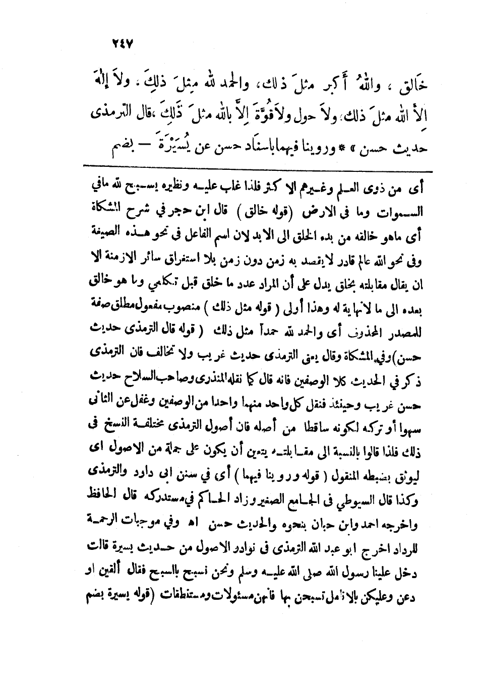 خَالِقٌ، واللهُ أَكْبَرُ مثلَ ذلكَ، والحمْدُ لِلهِ مِثْلَ ذلكَ، وَلا إلهَ إلا الله مثْلَ ذلكَ، وَلا حَوْلَ وَلا قُوَّةَ إلا بِاللهِ مِثْلَ ذلكَ" قال الترمذي: حديث حسن.
