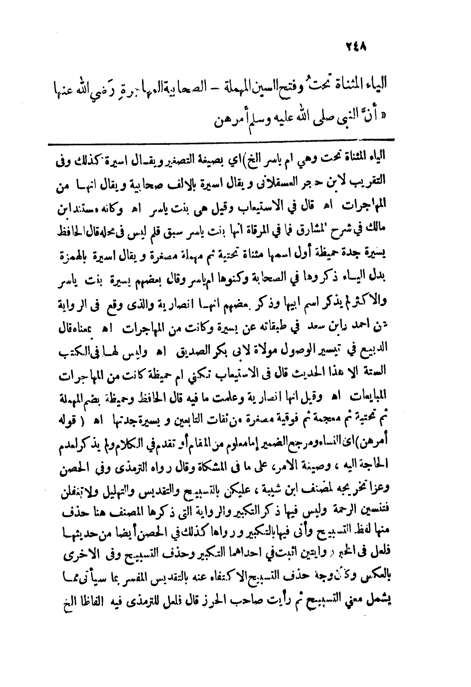 الياء المثناة تحتُ وهي أم ياسر إلخ) أي بصيغة التصغير ويقال أسيرة كذلك وفي التقريب لابن حجر العسقلاني ويقال أسيرة بالألف صحابية ويقال أنها من المهاجرات اهـ. قال في الاستيعاب وقيل هي بنت ياسر، وكأنه مستند ابن مالك في شرح المشارق فما في المرقاة أنها بنت ياسر سبق قلم ليس في محله قال الحافظ يسيرة جدة حميظة أول اسمها مثناة تحتية ثم مهملة مصغرة ويقال أسيرة بالهمزة بدل الياء ذكروها في الصحابة وكنوها أم ياسر وقال بعضهم يسيرة بنت ياسر والأكثر لم يذكر اسم أبيها وذكر بعضهم أنها أنصارية والذي وقع في الرواية عن أحمد وابن سعد في طبقاته عن يسيرة وكانت من المهاجرات اهـ، بمعناه قال الدبيع في تيسير الوصول مولاة لأبي بكر الصديق، وليس لها في الكتب الستة إلاّ هذا الحديث قال في الاستيعاب تكنى أم حميظة كانت من المهاجرات المبايعات اهـ، وقيل إنها أنصارية وعلمت ما فيه قال الحافظ وحميظة بضم المهملة ثم تحتية ثم معجمة ثم فوقية مصغرة من ثقات التابعين ويسيرة جدتها اهـ. قوله: (أمرهن) أي النساء ومرجع الضمير إما معلوم من المقام أو تقدم في الكلام ولم يذكر لعدم الحاجة إليه، وصيغة الأمر، على ما في المشكاة وقال رواه الترمذي وفي الحصين وعزا تخريجه لمصنف ابن شيبة، عليكن بالتسبيح والتقديس والتهليل ولا تغفلن فتنسين الرحمة وليس فيها ذكر التكبير والرواية التي ذكرها المصنف هنا حذف منها لفظ التسبيح وأتى فيها بالتكبير ورواها كذلك في الحصين أيضاً من حديثها فلعل في الخبر روايتين أثبت في إحداهما التكبير وحذف التسبيح وفي الأخرى بالعكس وكأن وجه حذف التسبيح الاكتفاء عنه بالتقديس المفسر بما سيأتي مما يشمل معنى التسبيح ثم رأيت صاحب الحرز قال فلعل للترمذي فيه ألفاظاً إلخ،