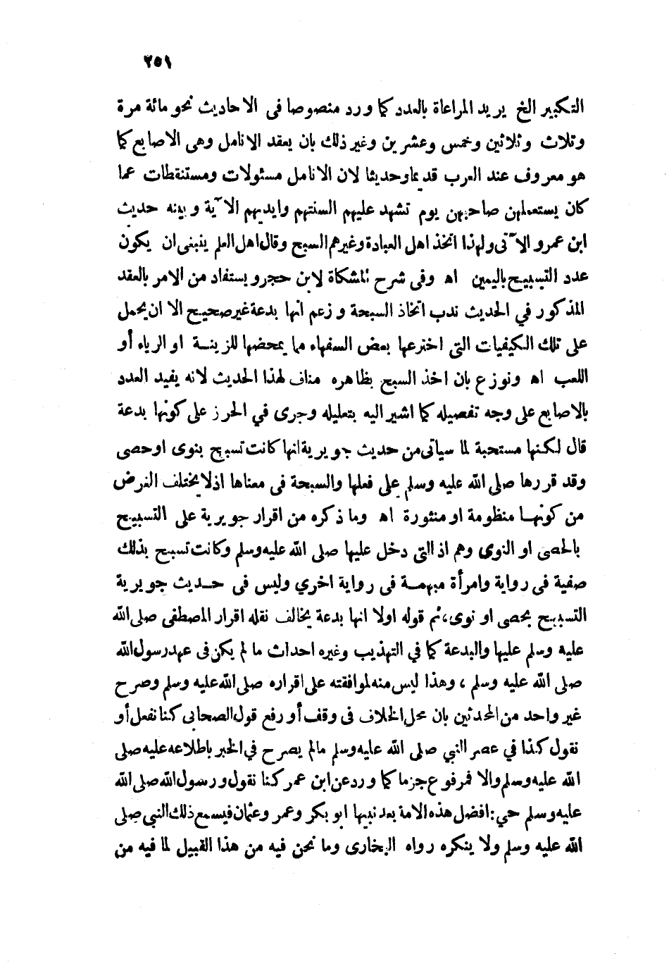 أو منثورة اهـ، وما ذكره من إقرار جويرية على التسبيح بالحصى أو النوى وهم إذ التي دخل عليها - صلى الله عليه وسلم - وكانت تسبح بذلك صفية في رواية وامرأة مبهمة في رواية أخرى وليس في حديث جويرية التسبيح بحصى أو نوى، ثم قوله أولاً أنها بدعة يخالف نقله إقرار المصطفى - صلى الله عليه وسلم - والبدعة كما في التهذيب وغيره إحداث ما لم يكن في عهد رسول الله - صلى الله عليه وسلم - وهذا ليس منه لموافقته على إقراره - صلى الله عليه وسلم - وصرح غير واحد من المحدثين بأن محل الخلاف في وقت أو رفع قول الصحابي كنا نفعل أو نقول كذا في عصر النبي - صلى الله عليه وسلم - ما لم يصرح في الخبر باطلاعه عليه - صلى الله عليه وسلم - وإلا فمرفوع جزماً كما ورد عن ابن عمر كنا نقول ورسول الله - صلى الله عليه وسلم - حي: أفضل هذه الأمة بعد نبيها أبو بكر وعمر وعثمان فيسمع ذلك النبي - صلى الله عليه وسلم - ولا ينكره رواه البخاري وما نحن فيه من هذا القبيل لما فيه من