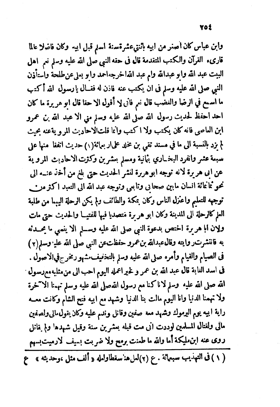 وابن عباس كان أصغر من أبيه باثنتي عشرة سنة أسلم قبل أبيه وكان فاضلاً عالماً قارئ القرآن والكتب المتقدمة قال في حقه النبي - صلى الله عليه وسلم - نعم أهل البيت عبد الله وأبو عبد الله وأم عبد الله أخرجه أحمد وأبو يعلى عن طلحة واستأذن النبي - صلى الله عليه وسلم - في أن يكتب عنه فأذن له فقال يا رسول الله أكتب ما أسمع في الرضا والغضب قال نعم فإني لا أقول إلاَّ حقاً قال أبو هريرة ما كان أحد أحفظ لحديث رسول الله - صلى الله عليه وسلم - مني إلاَّ عبد الله بن عمرو بن العاص فإنه كان يكتب ولا أكتب وإنما قلت الأحاديث المروية عنه بحيث لم يزد بالنسبة إلى ما في مسند تقي بن مخلد على أربعمائة حديث اتفقا منها على سبعة عشر وانفرد البخاري بثمانية ومسلم بعشرين وكثرت الأحاديث المروية عن أبي هريرة لأنه توجه أبو هريرة لنشر الحديث حتى بلغ من أخذ عنه إلى نحو ثمانمائة إنسان ما بين صحابي وتابعي وتوجه عبد الله إلى التعبد أكثر من توجهه للتعليم واعتزل الناس وكان بمكة والطائف ولم يكن الرحلة إليهما من طلبة العلم كالرحلة إلى المدينة وكان أبو هريرة متصدياً فيها للفتيا والحديث حتى مات ولأن أبا هريرة اختص بدعوة النبي - صلى الله عليه وسلم - إلا ينسى ما يحدثه به فانتشرت روايته وقال عبد الله بن عمرو حفظت عن النبي - صلى الله عليه وسلم - في الصيام والقيام وأمره - صلى الله عليه وسلم - بالتخفيف مشهور مخرج في الأصول.