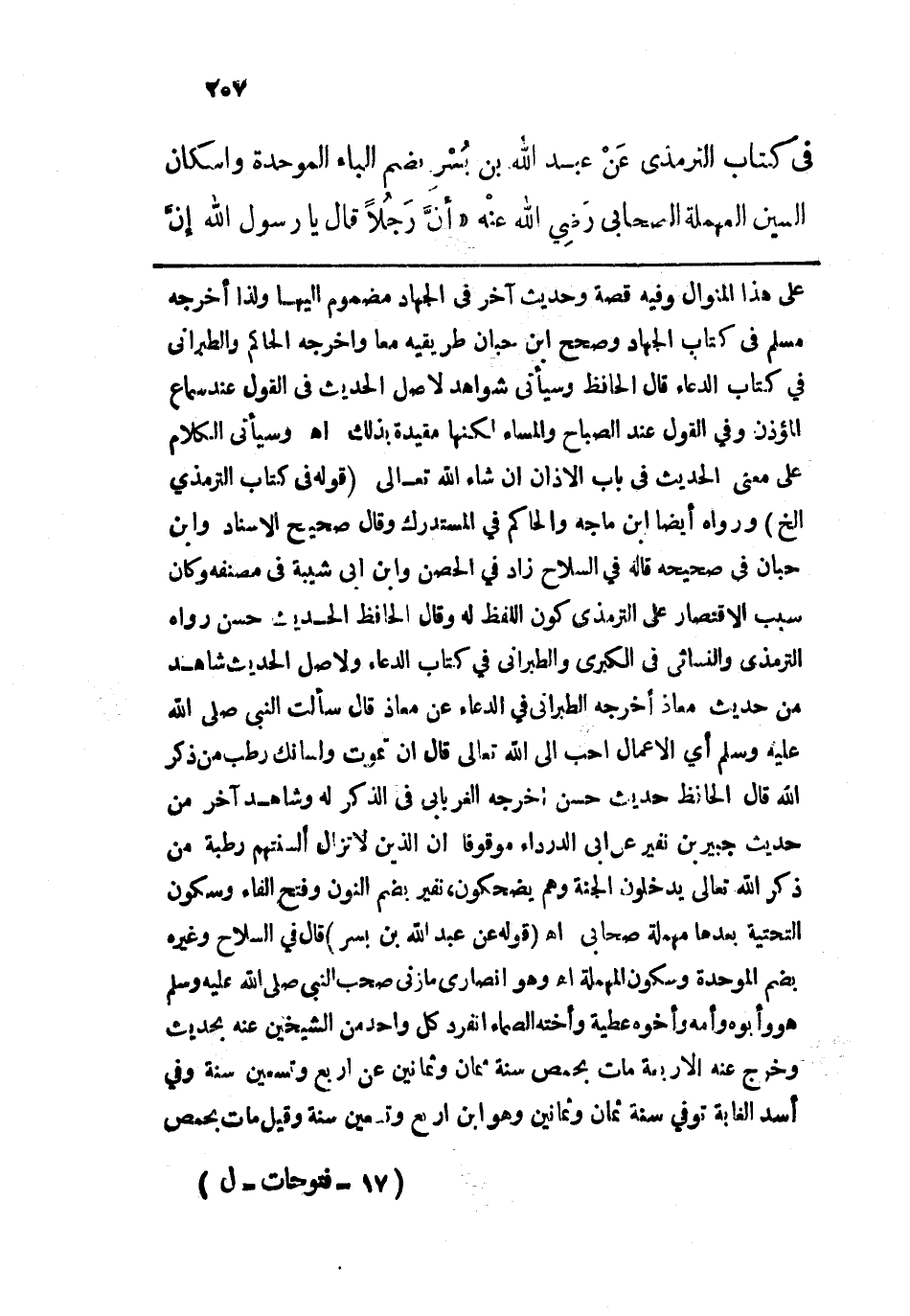 قوله: (في كتاب الترمذي إلخ) ورواه أيضاً ابن ماجة والحاكم في المستدرك وقال صحيح الإسناد وابن حبان في صحيحه قاله في السلاح زاد في الحصين وابن أبي شيبة في مصنفه وكان سبب الاقتصار على الترمذي كون اللفظ له وقال الحافظ الحديث حسن رواه الترمذي والنسائي في الكبرى والطبراني في كتاب الدعاء ولأصل الحديث شاهد من حديث معاذ أخرجه الطبراني في الدعاء عن معاذ قال سألت النبي - صلى الله عليه وسلم - أي الأعمال أحب إلى الله تعالى قال أن تموت ولسانك رطب من ذكر الله قال الحافظ حديث حسن أخرجه الفريابي في الذكر له وشاهد آخر من حديث جبير بن نفير عن أبي الدرداء موقوفاً إن الذين لا تزال ألسنتهم رطبة من ذكر الله تعالى يدخلون الجنة وهم يضحكون، نفير بضم النون وفتح الفاء وسكون التحتية بعدها مهملة صحابي اهـ. قوله: (عَنْ عبد الله بن بُسْرٍ) قال في السلاح وغيره بضم الموحدة وسكون المهملة اهـ، وهو أنصاري مازني صحب النبي - صلى الله عليه وسلم - هو وأبوه وأمه وأخوه عطية وأخته الصماء انفرد كل واحد من الشيخين عنه بحديث وخرج عنه الأربعة مات بحمص سنة ثمان وثمانين عن أربع وتسعين سنة وفي أسد الغابة توفي سنة ثمان وثمانين وهو ابن أربع وتسعين سنة وقيل مات بحمص