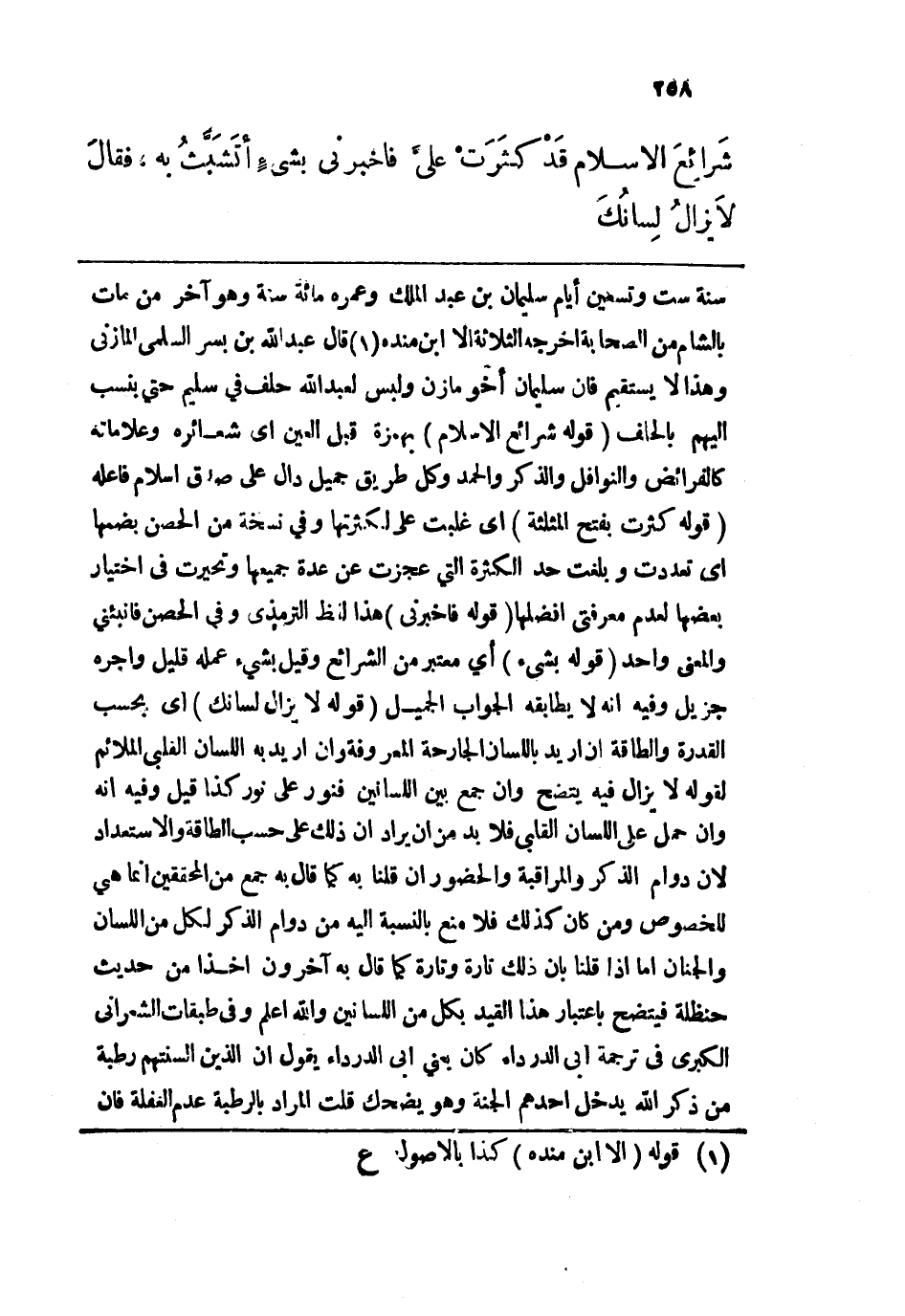 سنة ست وتسعين أيام سليمان بن عبد الملك وعمره مائة سنة وهو آخر من مات بالشام من الصحابة أخرجه الثلاثة إلاَّ ابن منده قال عبد الله بن بسر السلمي المازني وهذا لا يستقم فإن سليمان أخو مازن وليس لعبد الله حلف في سليم حتى ينسب إليهم بالحلف. قوله: (شَرائِعَ الإسلام) بهمزة قبل العين أي شعائره وعلاماته كالفرائض والنوافل والذكر والحمد وكل طريق جميل دال على صدق أسلام فاعله. قوله: (كثَرَتْ بفتح المثلثة) أي غلبت علي لكثرتها وفي نسخة من الحصين بضمها أي تعددت وبلغت حد الكثرة التي عجزت عن عدة جميعها وتحيرت في اختيار بعضها لعدم معرفتي أفضلها. قوله: (فأخبرني) هذا لفظ الترمذي وفي الحصين فأنبئني والمعنى واحد. قوله: (بشيءِ) أي معتبر من الشرائع وقيل بشيء عمله قليل وأجره جزيل وفيه أنه لا يطابقه الجواب الجميل. قوله: (لاَ يَزالُ لِسانُكَ) أي بحسب القدرة والطاقة إن أريد باللسان الجارحة المعروفة وإن أريد به اللسان القلبي الملائم لقوله لا يزال فيه يتضح وإن جمع بين اللسانين فنور على نور كذا قيل وفيه أنه وإن حمل على اللسان القلبي فلا بد من أن يراد إن ذلك على حسب الطاقة والاستعداد لأن دوام الذكر والمراقبة والحضور إن قلنا به كما قاله به جمع من المحققين إنما هي