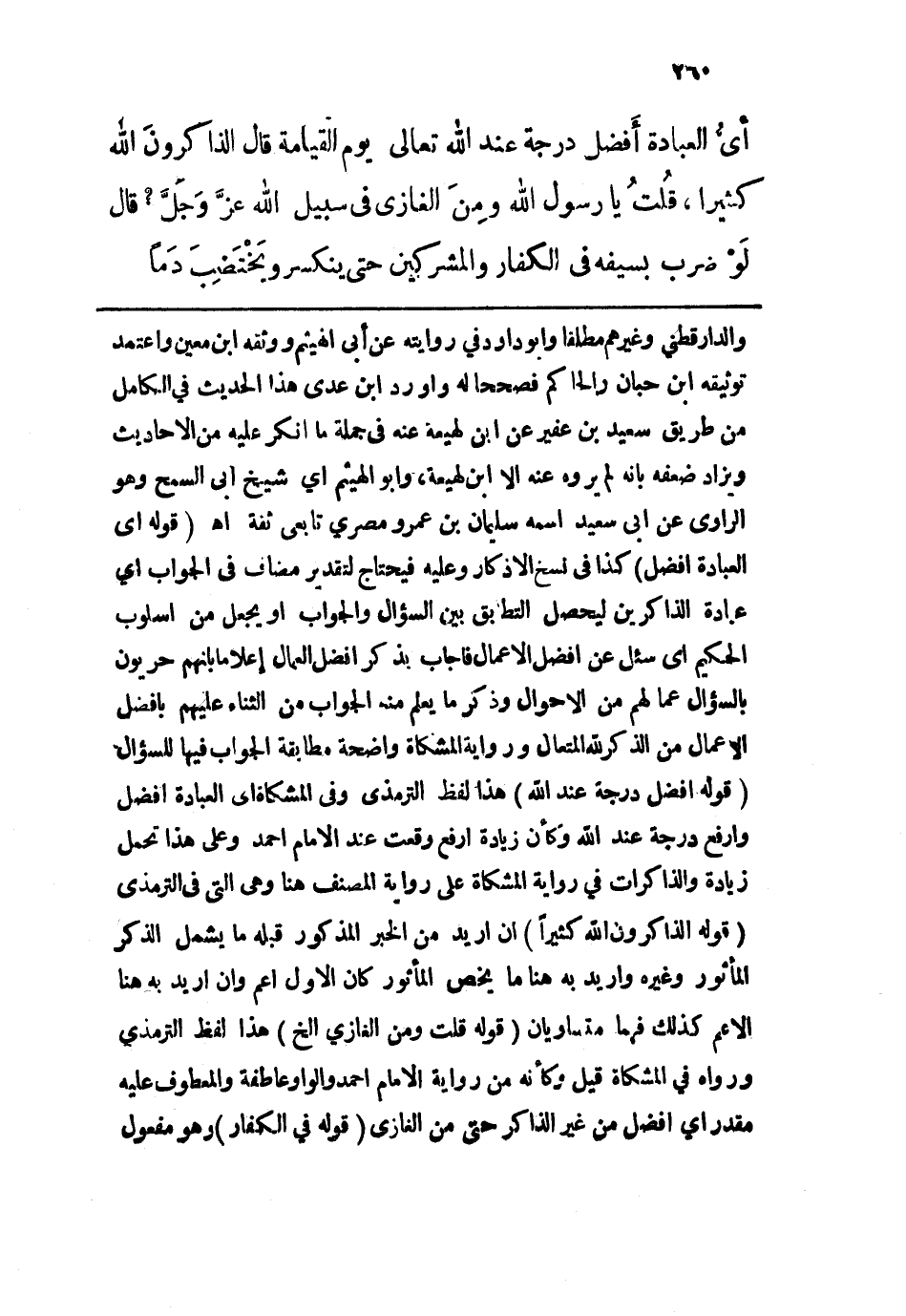 والدارقطني وغيرهم مطلقاً وأبو داود في روايته عن أبي الهيثم ووثقه ابن معين واعتمد توثيقه ابن حبان والحاكم فصححا له وأورد ابن عدي هذا الحديث في الكامل من طريق سعيد بن عفير عن ابن لهيعة عنه في جملة ما أنكر عليه من الأحاديث ويزاد ضعفه بأنه لم يروه عنه إلاَّ ابن لهيعة، وأبو الهيثم أي شيخ أبي السمح وهو الراوي عن أبي سعيد اسمه سليمان بن عمرو مصري تابعي ثقة اهـ. قوله: (أيُّ العبادة أفضل) كذا في نسخ الأذكار وعليه فيحتاج لتقدير مضاف في الجواب أي عبادة الذاكرين ليحصل التطابق بين السؤال والجواب أو يجعل من أسلوب الحكيم أي سئل عن أفضل الأعمال فأجاب بذكر أفضل العمال إعلاماً بأنهم حريون بالسؤال عما لهم من الأحوال وذكر ما يعلم منه الجواب من الثناء عليهم بأفضل الأعمال من الذكر لله المتعال ورواية المشكاة واضحة مطابقة الجواب فيها للسؤال. قوله: (أفضل درجة عند الله) هذا لفظ الترمذي وفي المشكاة أي العبادة أفضل وأرفع درجة عند الله وكأن زيادة أربع وقعت عند الإمام أحمد وعلى هذا تحمل زيادة والذاكرات في رواية المشكاة على رواية المصنف هنا وهي التي في الترمذي. قوله: (الذاكرونَ الله كثيراً) إن أريد من