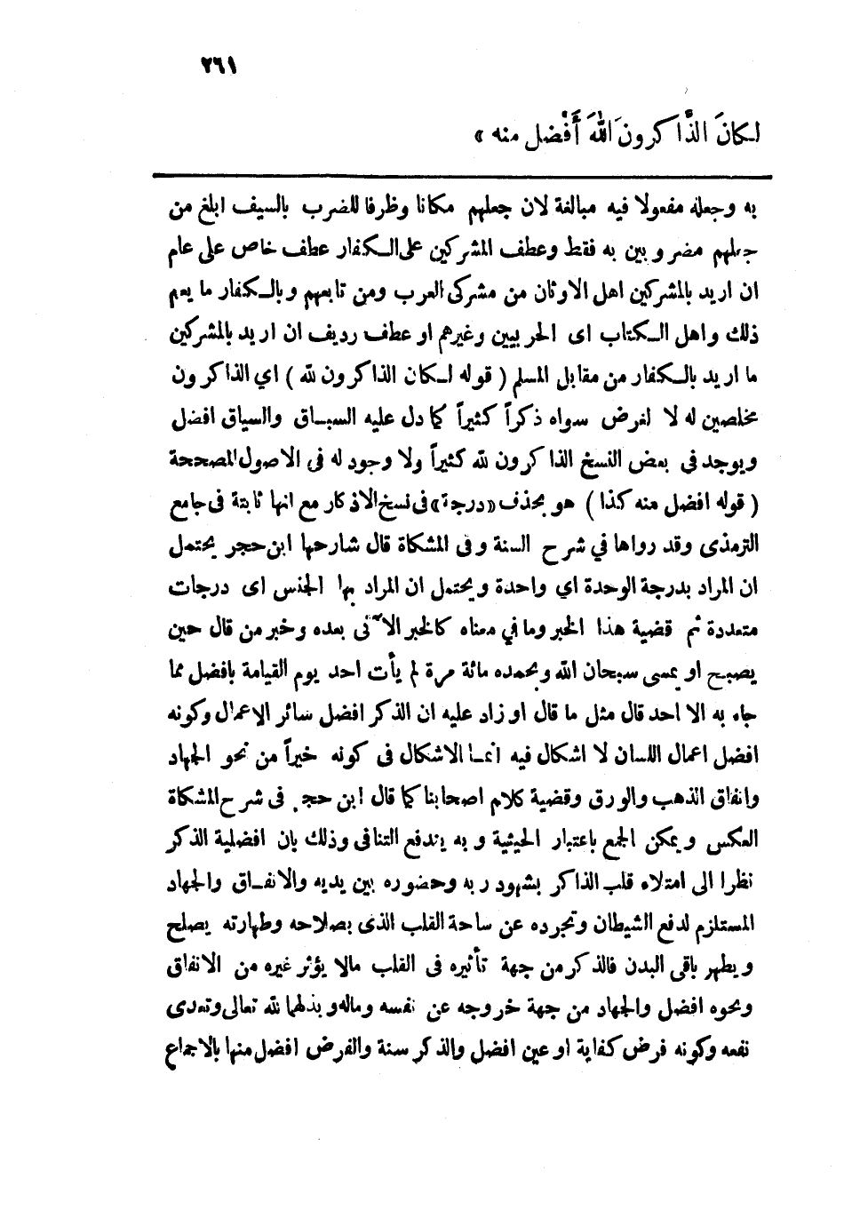 به وجعله مفعولاً فيه مبالغة لأن جعلهم مكاناً وظرفاً للضرب بالسيف أبلغ من جعلهم مضروبين به فقط وعطف المشركين على الكفار عطف خاص على عام إن أريد بالمشركين أهل الأوثان من مشركي العرب ومن تابعهم وبالكفار ما يعم ذلك وأهل الكتاب أي الحربيين وغيرهم أو عطف رديف إن أريد بالمشركين ما أريد بالكفار من مقابل المسلم. قوله: (لكانَ الذاكرونَ لله) أي الذاكرون مخلصين له لا لغرض سواه ذكراً كثيراً كما دل عليه السباق والسياق لفضل ويوجد في بعض النسخ الذاكرون لله كثيراً ولا وجود له في الأصول المصححة. قوله: (أَفْضل منه كذا) هو بحذف "درجة" في نسخ الأذكار مع أنها ثابتة في جامع الترمذي وقد رواها في شرح السنة وفي المشكاة قال شارحها ابن حجر يحتمل إن المراد بدرجة الوحدة أي واحدة ويحتمل إن المراد بها الجنس أي درجات متعددة ثم قضية هذا الخبر وما في معناه كالخبر الآتي بعده وخبر من قال حين يصبح أو يمسي سبحان الله وبحمده مائة مرة لم يأت أحد يوم القيامة بأفضل مما جاء به إلاَّ قال مثل ما قال أو زاد عليه إن الذكر أفضل سائر الأعمال وكونه أفضل أعمال اللسان لا إشكال فيه إنما الإشكال في كونه خيراً من نحو الجهاد وإنفاق الذهب والورق وقضية كلام أصحابنا كما قال ابن حجر في شرح المشكاة العكس ويمكن الجمع باعتبار الحيثية وبه يندفع التنافي وذلك بأن أفضلية الذكر نظراً إلى امتلاء قلب الذاكر بشهود ربه وحضوره بين يديه والإنفاق والجهاد المستلزم لدفع الشيطان وتجرده عن ساحة القلب الذي بصلاحه وطهارته يصلح ويطهر باقي البدن فالذكر من جهة تأثيره في القلب ما لا يؤثر غيره من الإنفاق ونحوه أفضل والجهاد من جهة خروجه عن نفسه وماله وبذلهما لله تعالى وتعدي نفعه وكونه فرض كفاية أو عين أفضل والذكر سنة والفرض أفضل منها بالإجماع