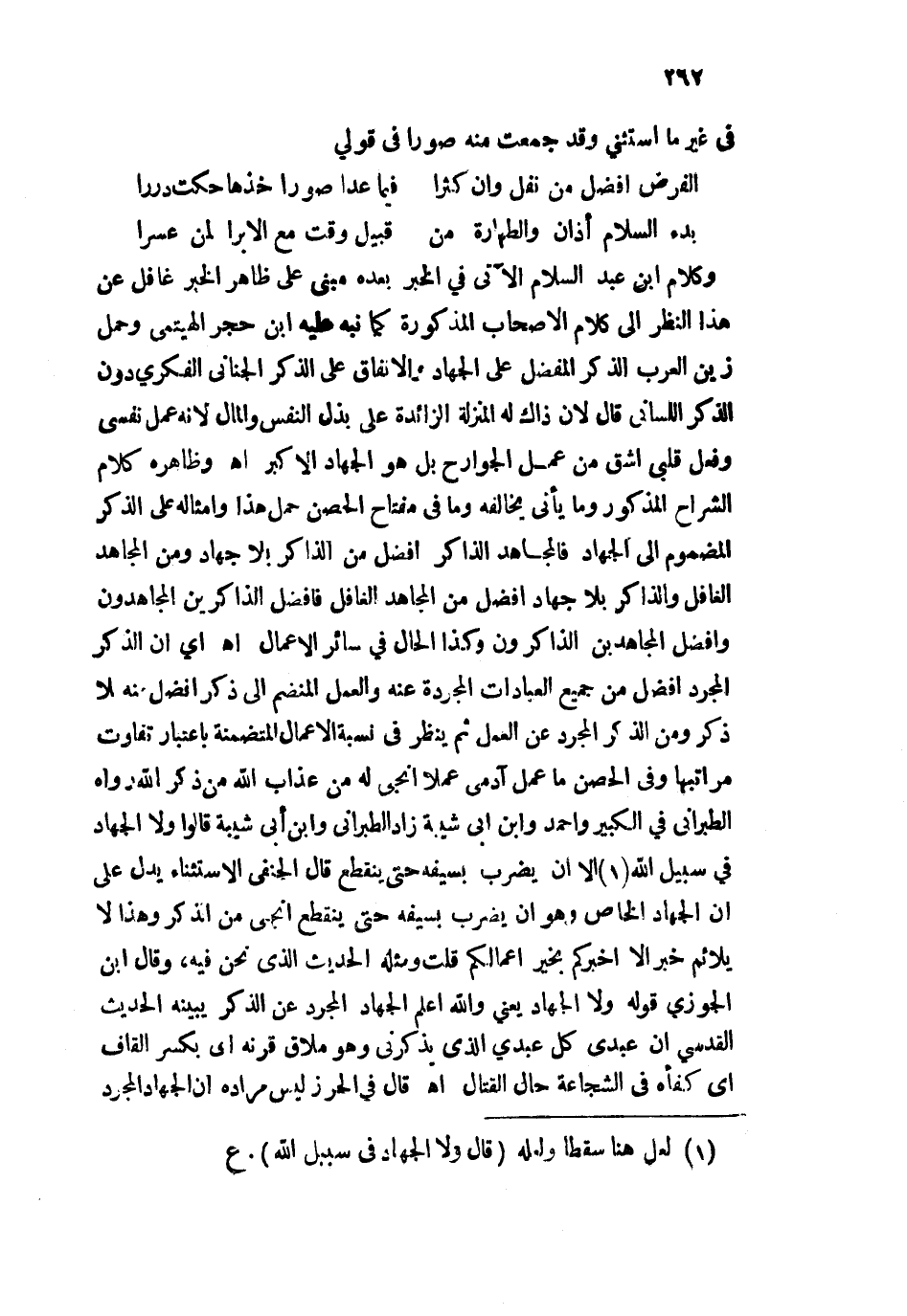 وكلام ابن عبد السلام الآتي في الخبر بعده مبني على ظاهر الخبر غافل عن هذا النظر إلى كلام الأصحاب المذكورة كما نبه عليه ابن حجر الهيتمي وحمل زين العرب الذكر المفضل على الجهاد والإنفاق على الذكر الجناني الفكري دون الذكر اللساني قال لأن ذاك له المنزلة الزائدة على بذل النفس والمال لأنه عمل نفسي وفعل قلبي أشق من عمل الجوارح بل هو الجهاد الأكبر اهـ، وظاهره كلام الشراح المذكور وما يأتي يخالفه وما في مفتاح الحصين حمل هذا وأمثاله على الذكر المضموم إلى الجهاد فالمجاهد الذاكر أفضل من الذاكر بلا جهاد ومن المجاهد الغافل والذاكر بلا جهاد أفضل من المجاهد الغافل فأفضل الذاكرين المجاهدون وأفضل المجاهدين الذاكرون وكذا الحال في سائر