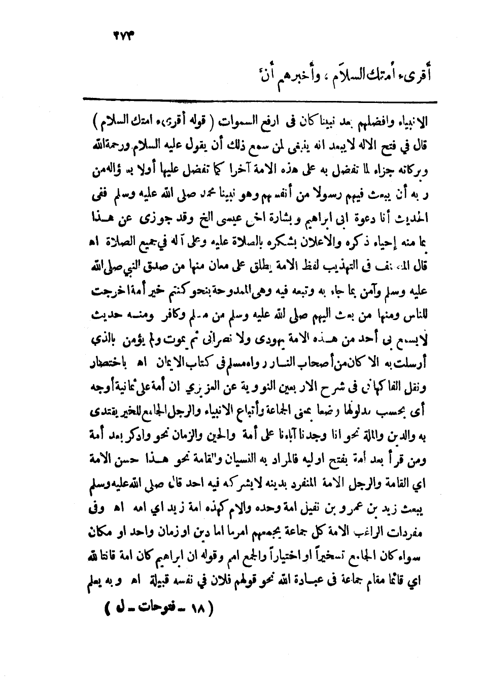 الأنبياء وأفضلهم بعد نبينا كان في أرفع السموات. قوله: (أقرئ أمتك السلاَم) قال في فتح الإله لا يبعد أنه ينبغي لمن سمع ذلك أن يقول عليه السلام ورحمة الله وبركاته جزاء لما تفضل به على هذه الأمة آخراً كما تفضل عليها أولاً بسؤاله من ربه أن يبعث فيهم رسولاً من أنفسهم وهو نبينا محمد - صلى الله عليه وسلم - ففي الحديث أنا دعوة أبي إبراهيم وبشارة أخي عيسى إلخ وقد جوزي عن هذا بما منه إحياء ذكره والإعلان بشكره بالصلاة عليه وعلى آله في جميع الصلاة اهـ. قال المصنف في التهذيب لفظ الأمة يطلق على معاني منها من صدق النبي - صلى الله عليه وسلم - وآمن بما جاء به وتبعه فيه وهي الممدوحة بنحو: {كُنْتُمْ خَيْرَ أُمَّةٍ أُخْرِجَتْ} [آل عمران: 110] ومنها من بعث إليهم - صلى الله عليه وسلم - من مسلم وكافر ومنه حديث لا يسمع بي أحد من هذه الأمة يهودي ولا نصراني ثم يموت ولم يؤمن بالذي أرسلت به إلاّ كان من أصحاب النار رواه مسلم في كتاب الإيمان اهـ، باختصار ونقل الفاكهاني في شرح الأربعين النووية عن العزيزي إن أمة على ثمانية أوجه أي بحسب مدلولها وضعا بمعنى الجماعة وإتباع الأنبياء والرجل الجامع للخير يقتدي به والدين والملة نحو: {بَلْ قَالُوا إِنَّا وَجَدْنَا آبَاءَنَا عَلَى