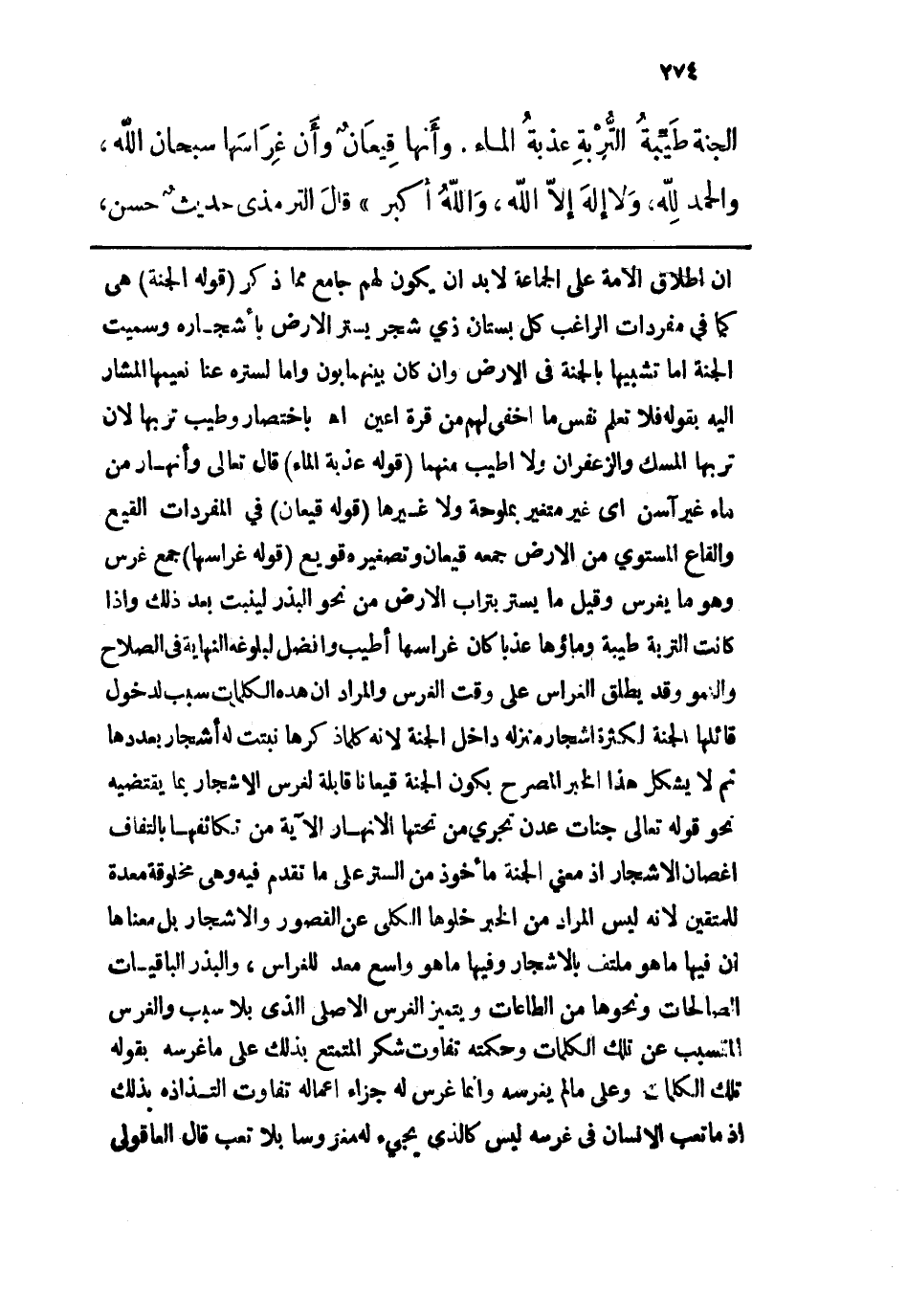 إن إطلاق الأمة على الجماعة لا بد أن يكون لهم جامع مما ذكر. قوله: (الجنة) هي كما في مفردات الراغب كل بستان ذي شجر يستر الأرض بأشجاره وسميت الجنة إما تشبيهاً بالجنة في الأرض وإن كان بينهما بون وإما لستره عنا نعيمها المشار إليه بقوله: {فَلَا تَعْلَمُ نَفْسٌ مَا أُخْفِيَ لَهُمْ مِنْ قُرَّةِ أَعْيُنٍ} [السجدة: 17] اهـ، باختصار وطيب تربها لأن تربها المسك والزعفران ولا أطيب منها. قوله: (عذبةُ الماء) قال تعالى: {أَنْهَارٌ مِنْ مَاءٍ غَيْرِ آسِنٍ} [محمد: 15] أي غير متغير بملوحة ولا غيرها. قوله: (قيعَانٌ) في المفردات القيع والقاع المستوي من الأرض جمعه قيعان وتصغيره قويع. قوله: (غرَاسَها) جمع غرس وهو ما يغرس وقيل ما يستر تراب الأرض من نحو البذر لينبت بعد ذلك وإذا كانت التربة طيبة وماؤها عذباً كان غراسها أطيب وأفضل لبلوغه النهاية في الصلاح والنمو وقد يطلق الغراس على وقت الغرس والمراد إن هذه الكلمات سبب لدخول قائلها الجنة لكثرة أشجار منزله داخل الجنة لأنه كلما ذكرها نبتت له أشجار بعددها ثم لا يشكل هذا الخبر المصرح يكون الجنة قيعاناً قابلة لغرس الأشجار بما يقتضيه نحو قوله تعالى: {جَنَّاتُ عَدْنٍ تَجْرِي مِنْ تَحْتِهَا الْأَنْهَارُ} [طه: 76] الآية من تكاثفها بالتفاف أغصان الأشجار إذ معنى الجنة مأخوذ من الستر على ما تقدم فيه وهي مخلوقة معدة للمتقين لأنه ليس المراد من الخبر خلوها الكلي عن القصور والأشجار بل معناها إن فيها ما هو ملتف بالأشجار وفيها ما هو واسع معد للغراس، والبذر الباقيات الصالحات ونحوها من الطاعات ويتميز الغرس الأصلي الذي بلا سبب والغرس المتسبب عن تلك الكلمات وحكمته تفاوت شكر المتمتع بذلك على ما غرسه بقوله تلك الكلمات وعلى ما لم يغرسه وإنما غرس له جزاء أعماله تفاوت التذاذه بذلك إذ ما تعب الإنسان في غرسه ليس كالذي يجيء له مغروساً بلا تعب قال العاقولي