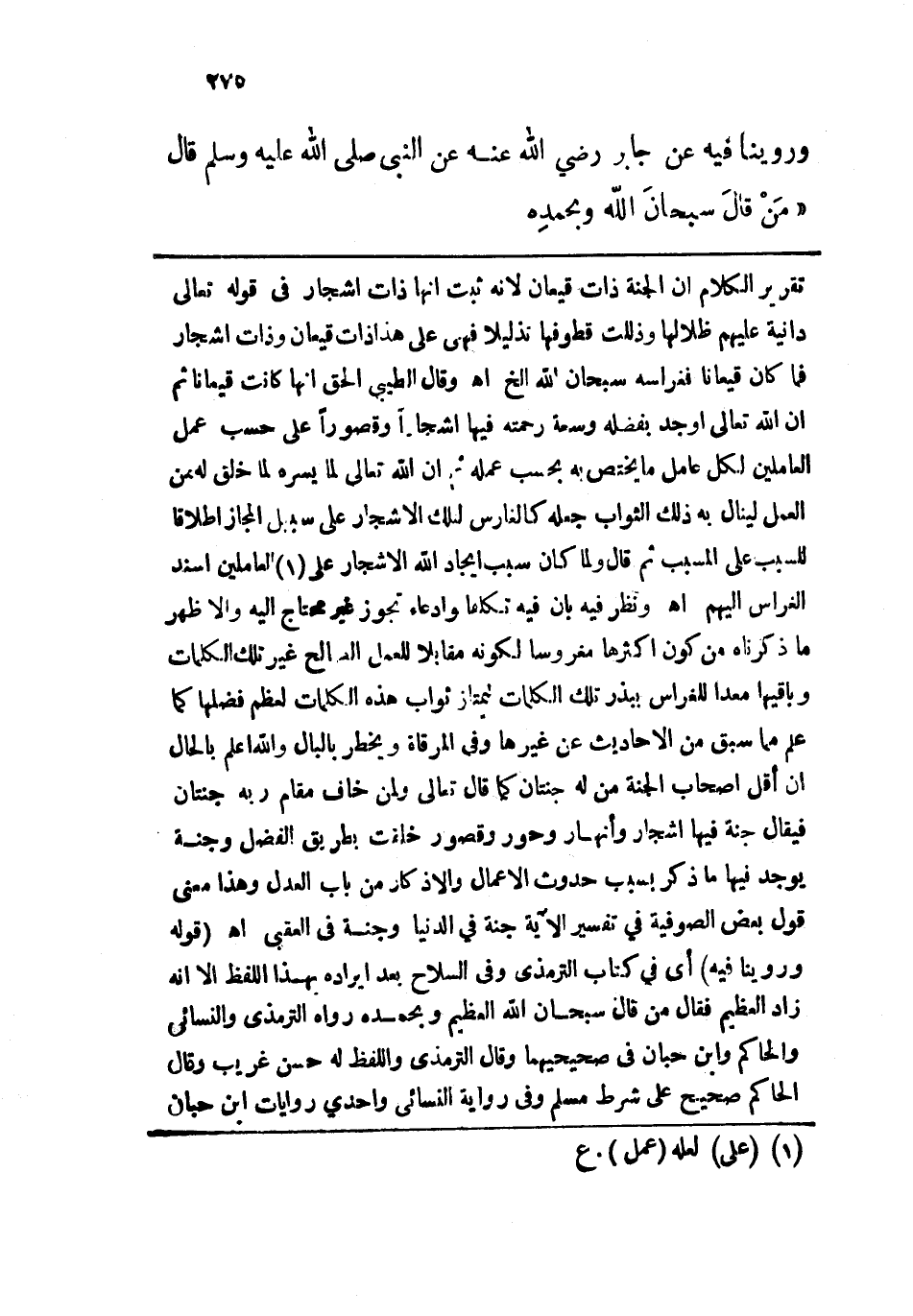وروينا فيه عن جابر رضي الله عنه عن النبي - صلى الله عليه وسلم - من قال: "مَنْ قالَ: سَبْحانَ اللهِ وبِحَمْدِهِ،