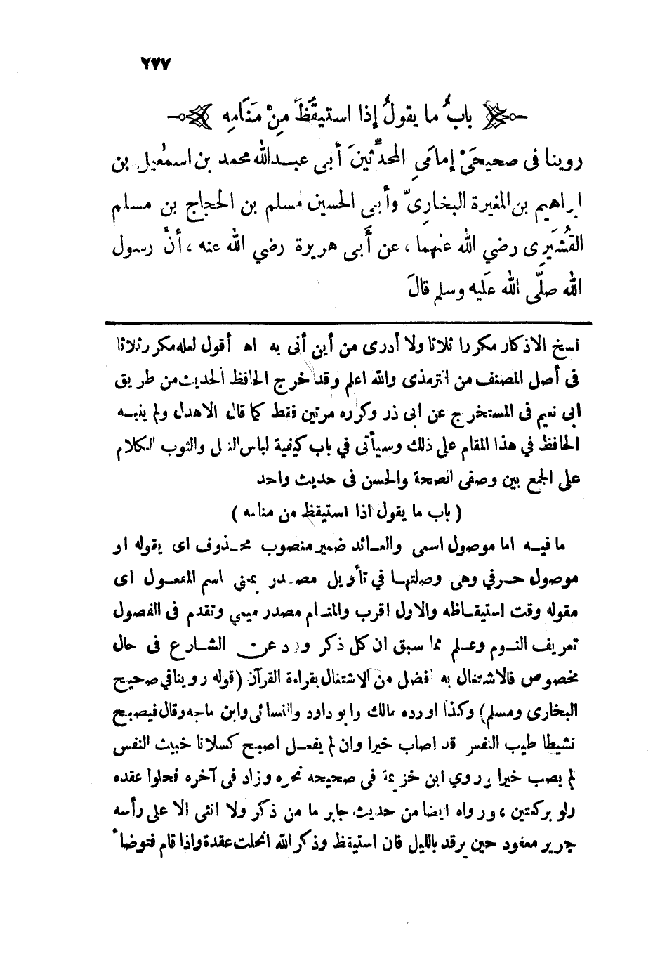 ما فيه إما موصول اسمي والعائد ضمير منصوب محذوف أي يقوله أو موصول حرفي وهي وصلتها في تأويل مصدر بمعنى اسم المفعول أي مقوله وقت استيقاظه والأول أقرب والمنام مصدر ميمي وتقدم في الفصول تعريف النوم وعلم مما سبق إن كل ذكر ورد عن الشارع في حال مخصوص فالاشتغال به أفضل من الاشتغال بقراءة القرآن. قوله: (وينافي صحيح البخاري ومسلم) وكذا أورده مالك وأبو داود والنسائي وابن ماجة وقال فيصبح نشيطاً طيب النفس قد أصاب خيراً وإن لم يفعل أصبح كسلاناً خبيث النفس لم يصب خيراً وروى ابن خزيمة في صحيحه نحره وزاد في آخره فحلوا عقدة ولو بركعتين، ورواه أيضاً من حديث جابر ما من ذكر ولا أنثى إلاَّ على رأسه جرير معقود حين يرقد بالليل فإن استيقظ وذكر الله انحلت عقدة وإذا قام فتوضأ
