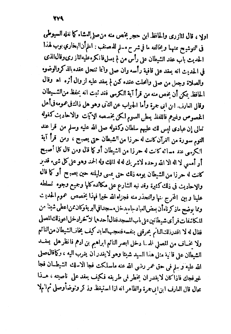 على رأس من لم يصل فأنكره عليه المازري وقال الذي في الحديث أنه يعقد على قافية رأسه وإن صلى وإنما تنحل عقده بالذكر والوضوء والصلاة وجعل من صلى وانحلت عقده كمن لم يعقد عليه لزوال أثره اهـ. وقال الحافظ يمكن أن يخص منه من قرأ آية الكرسي فقد ثبت أنه يحفظ من الشيطان وقال العارف ابن أبي جمرة وأما الجواب عن الثاني وهو هل ذاك في عمومه في أهل الخصوص وغيرهم فاللفظ يعطي العموم لكن يخصصه الآيات والأحاديث كقوله تعالى: {إِنَّ عِبَادِي لَيْسَ لَكَ عَلَيْهِمْ سُلْطَانٌ} [الحجر: 42] وكقوله - صلى الله عليه وسلم - من قرأ عند النوم سورة من القرآن كانت له حرزاً من الشيطان حتى يصبح، ومن قرأ آية الكرسي عند مسائه كانت له حرزاً من الشيطان أو كما قال ومن قال كلما أصبح أو أمسى لا إله إلاّ الله وحده لا شريك له، له الملك وله الحمد وهو على كل شيء قدير كانت له حرزاً من الشيطان يومه ذلك حتى يمسي وليلته حين يصبح أو كما قال والأحاديث في ذلك كثيرة وقد نبه الشارع على مكائده كلها وجميع وجوه تسلطه علينا وبين المخرج منها والتحذر منه فجزاه الله خيرًا فهذا يخصص عموم الحديث ومما يوضح ما ذكرناه أن بعض العباد جاء يدخل مسجداً في البرية وكان ممن أعطى شيئاً من المكاشفات فرأى شيطانين على باب المسجد فقال أحدهما للآخر ادخل أعوذ لك المصلي فقال له لا أقدر ذلك النائم يحرقني بنفسه فتعجب العابد كيف يخاف الشيطان من النائم ولا يخاف من المصلى فلما دخل أبصر النائم إبراهيم بن أدهم فانظر هل يعقد الشيطان على قافية مثل هذا السيد شيئاً وهو لا يقدر إن يقرب إليه، وكما قال - صلى الله عليه وسلم - في حق عمر رضي الله عنه ما سلكت فجا إلا سلك الشيطان فجاً غير فجك فإذا كان لا يقدر إن يخطر في طريقه فكيف يعقد على ناصيته، هذا محال قال العارف ابن أبي جمرة والظاهر أنه إذا استيقظ وذكر وتوضأ وصلى ثم نام لا